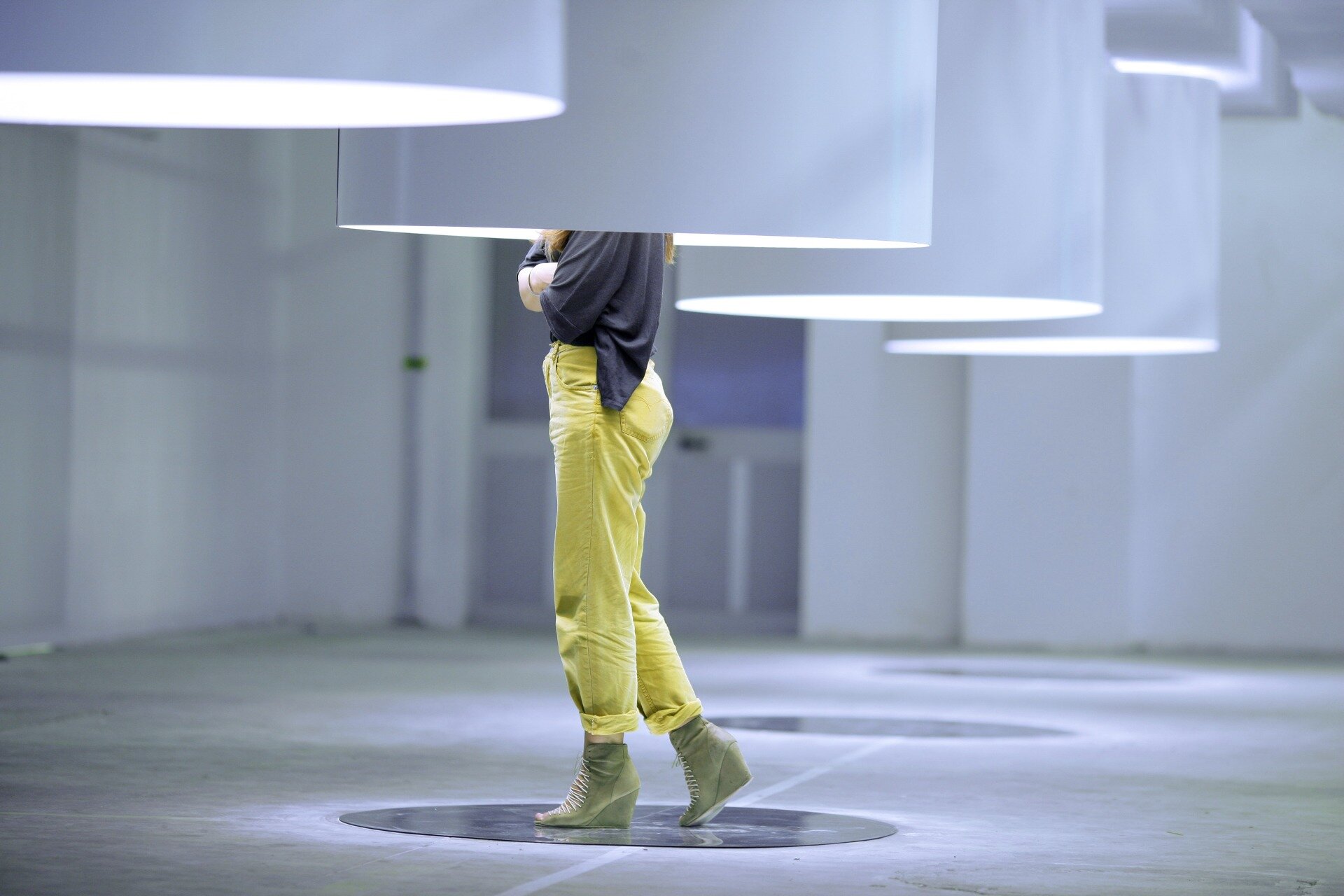 For the exhibition, held in a former tobacco factory, Brigada installed ten white cylinders, each functioning as a “mini pavilion” presenting one annual report. On the exterior of each cylinder, important events associated with that year were listed, while on the inside, the specific design of the annual report was displayed. By “entering” a mini pavilion, visitors created their own micro space where they could briefly get away from the bustle of the festival and view the exhibition in peace. Visitors who refrained from ducking inside were able to view the presented materials in circular mirrors placed on the floor underneath each cylinder.