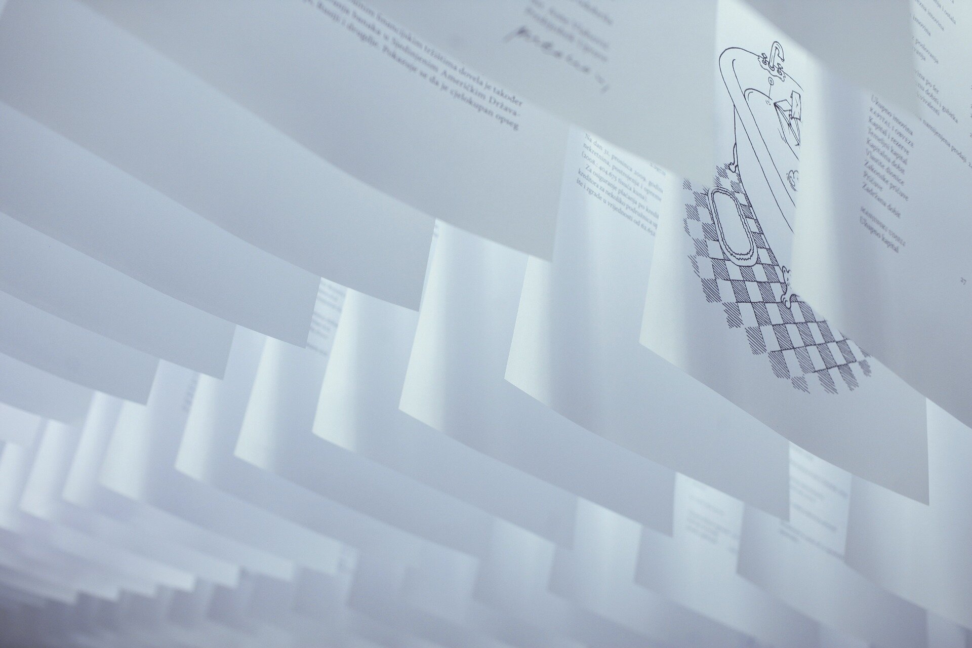 The ceiling of the pavilion was filled with hundreds of enlarged, printed pages from all ten annual reports that, suspended from a specially devised substructure, created a unique texture evocative of the tobacco leaves that used to hang in the space while drying. Light filtering through the sheets of paper created a “dematerialization” of the ceiling surface while at the same time allowing visitors to study whichever page caught their interest.