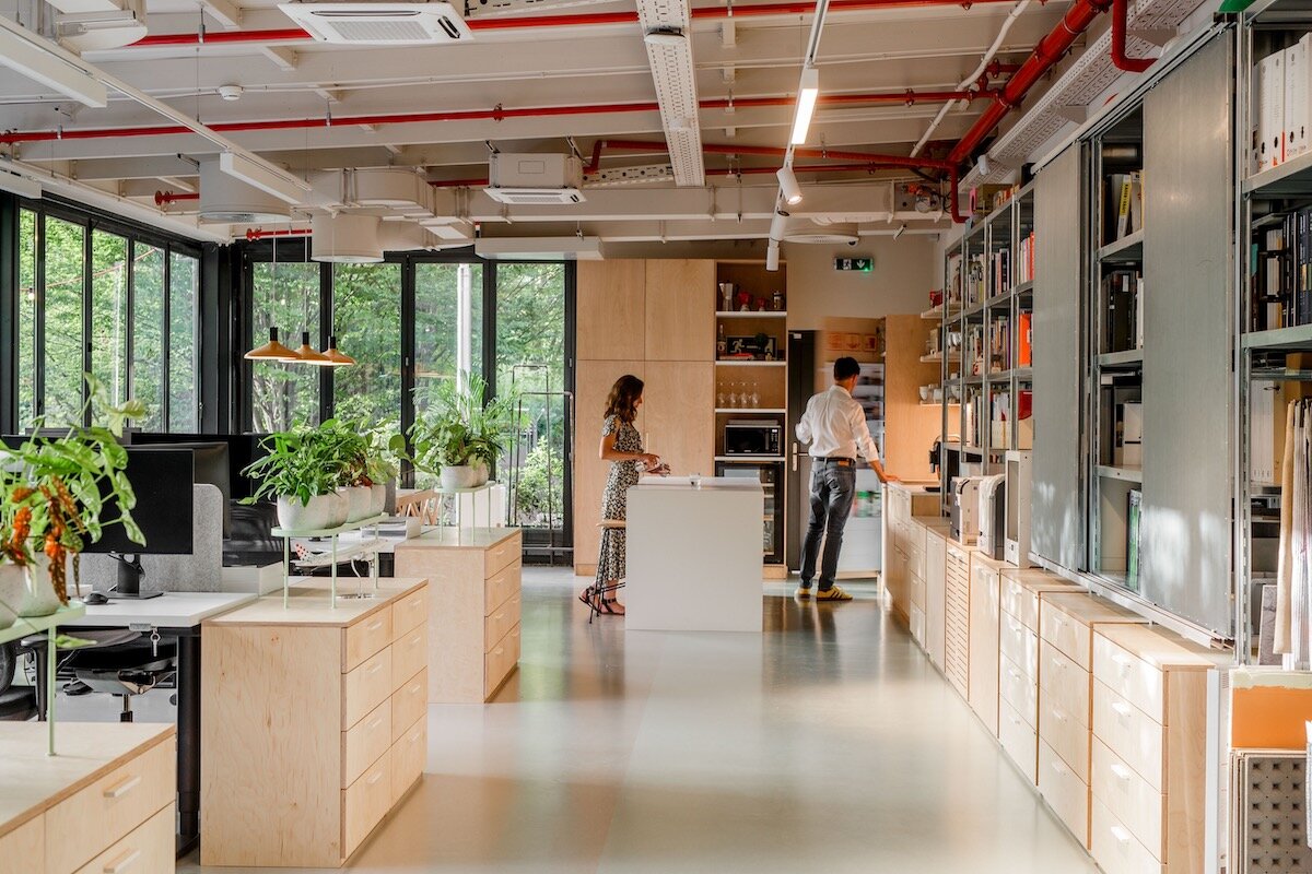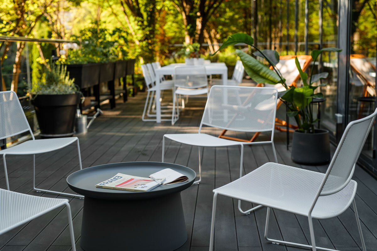 A hidden door separates the showroom from the office area, and the sole hint of what is behind the door is a porthole through which one can catch a glimpse of the agency’s working atmosphere. The workspace is defined by a large glass wall that opens towards the terrace and the surrounding greenery, which thus become an integral part of the interior. In addition to the workstations, an essential element of the workspace is a large library with patterns, professional literature, and panels for mood boards and the elaboration of design processes. The linearly designed interior ends with a kitchen and a dining room that open onto the terrace, which acts as an alternative workspace, a summer dining room, and a garden where the agency’s employees grow organic vegetables and herbs.