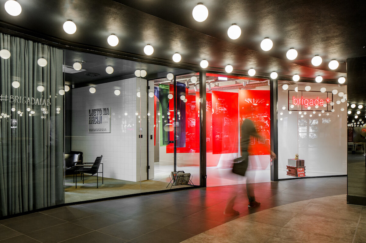 In front of the concealed workspace, there is an experimental showroom - a testing ground for new design solutions and materials, as well as a space for collaboration between Brigada and the visiting creatives. The showroom is a showcase towards the public space of the Centar Kaptol, and the setup that periodically changes continually offers new content to our clients and visitors to the mall.