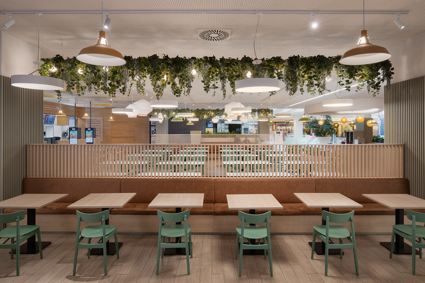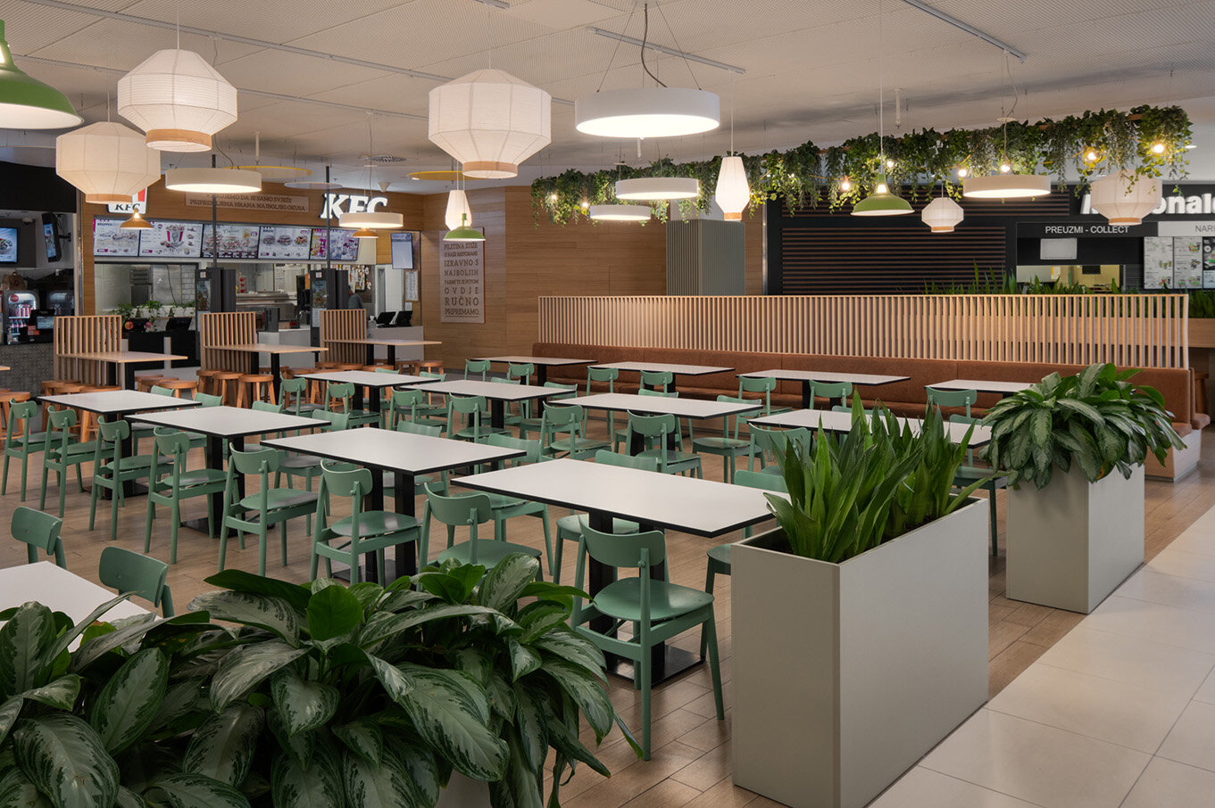 By incorporating distinctive design elements, the space is transformed into an inviting indoor courtyard where people can relax, connect, and enjoy food and drinks together, much like the lively ambiance of a market or street food event. Abundant greenery and string lights enhance the sense of warmth and vibrancy, turning the Foodcourt into a destination in itself – not just a place to eat, but a unique brand experience.