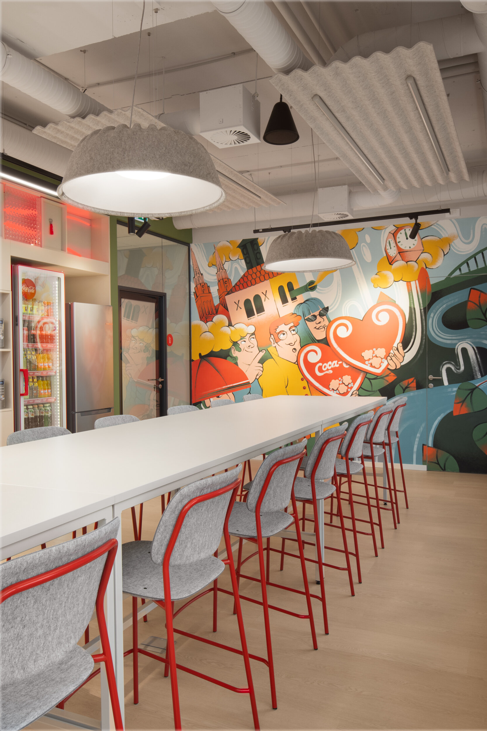 The Coca-Cola Adria office in Zagreb showcases a thoughtful approach to modern workplace environments, emphasizing quality, functionality, and employee wellbeing. The space is carefully crafted to achieve a harmonious balance between warm tones and accent colors, creating a welcoming yet professional atmosphere.