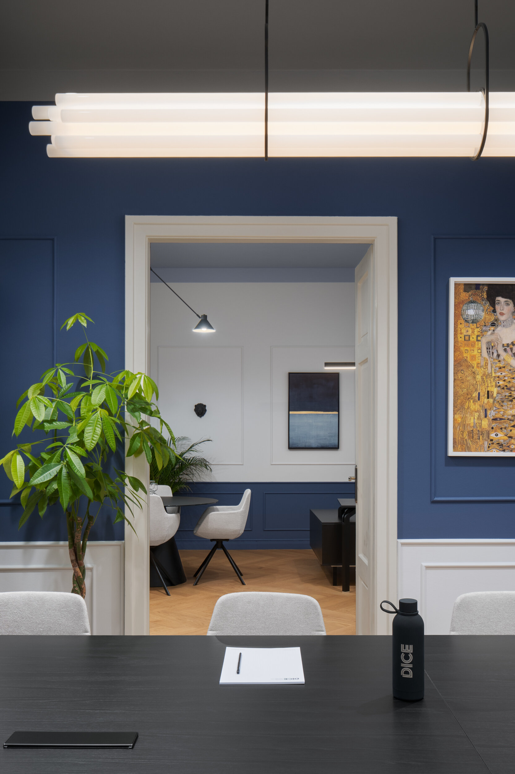 Our goal was to respect the context of the location and its historic architecture, while creating a functional, contemporary workspace that supports the everyday needs of its users. At the same time, we wanted to introduce an element of informality - something that allows for relaxation and play. This layer was further enriched by DICE’s internal team, who developed a series of engaging spatial details and accents, combining well-known artworks with internal jokes in the form of images and posters.