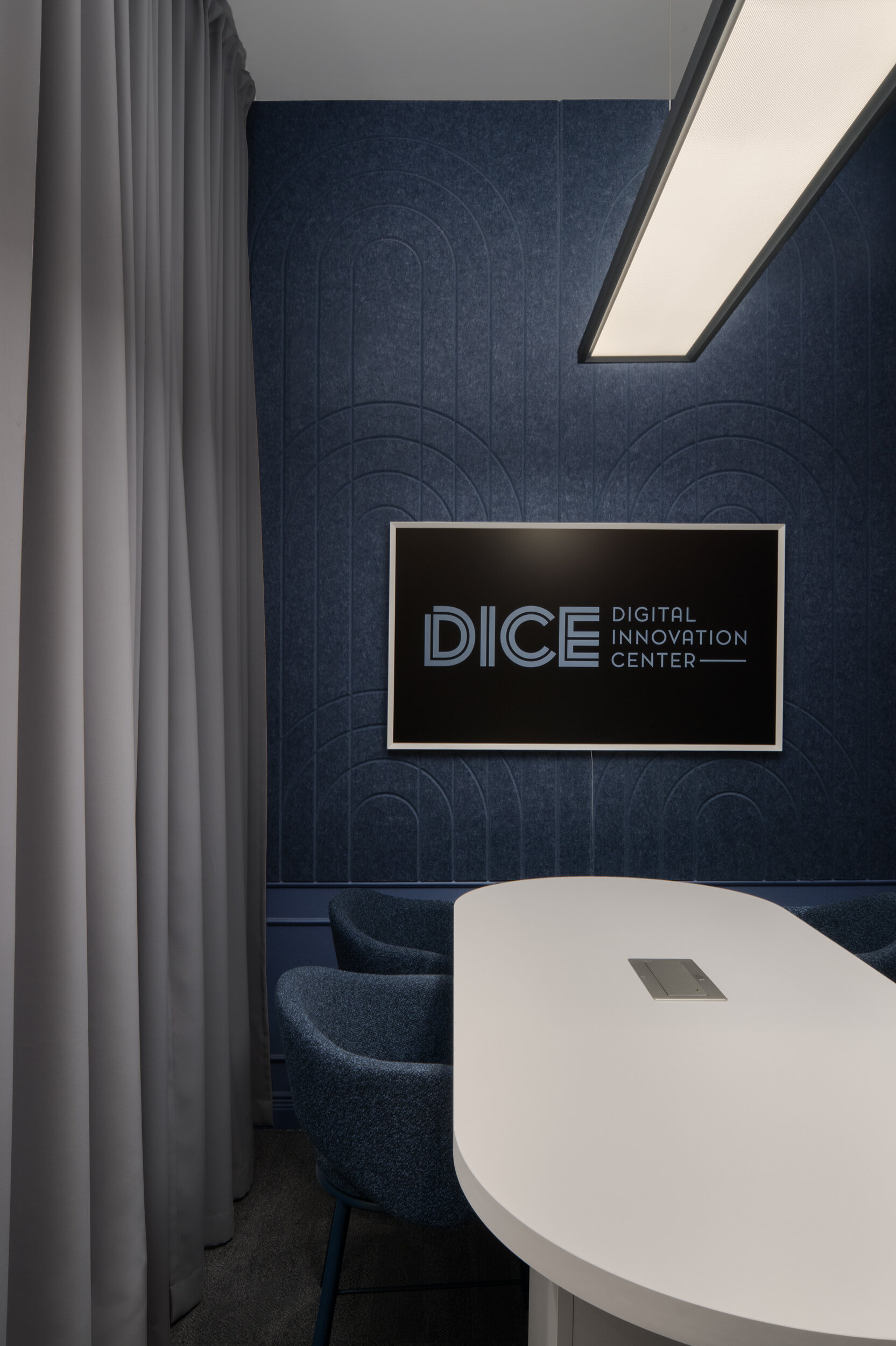 Repetition of patterns, curved lines, and relief elements appear in acoustic panels, door frames, and in the pronounced contrasts of spatial heights articulated through colour and texture. Darker textiles contribute to a sense of refinement, while a contemporary layer is introduced through elements such as digital mirror screens for wayfinding, as well as DICE’s new minimalist visual identity, subtly integrated through environmental graphics.