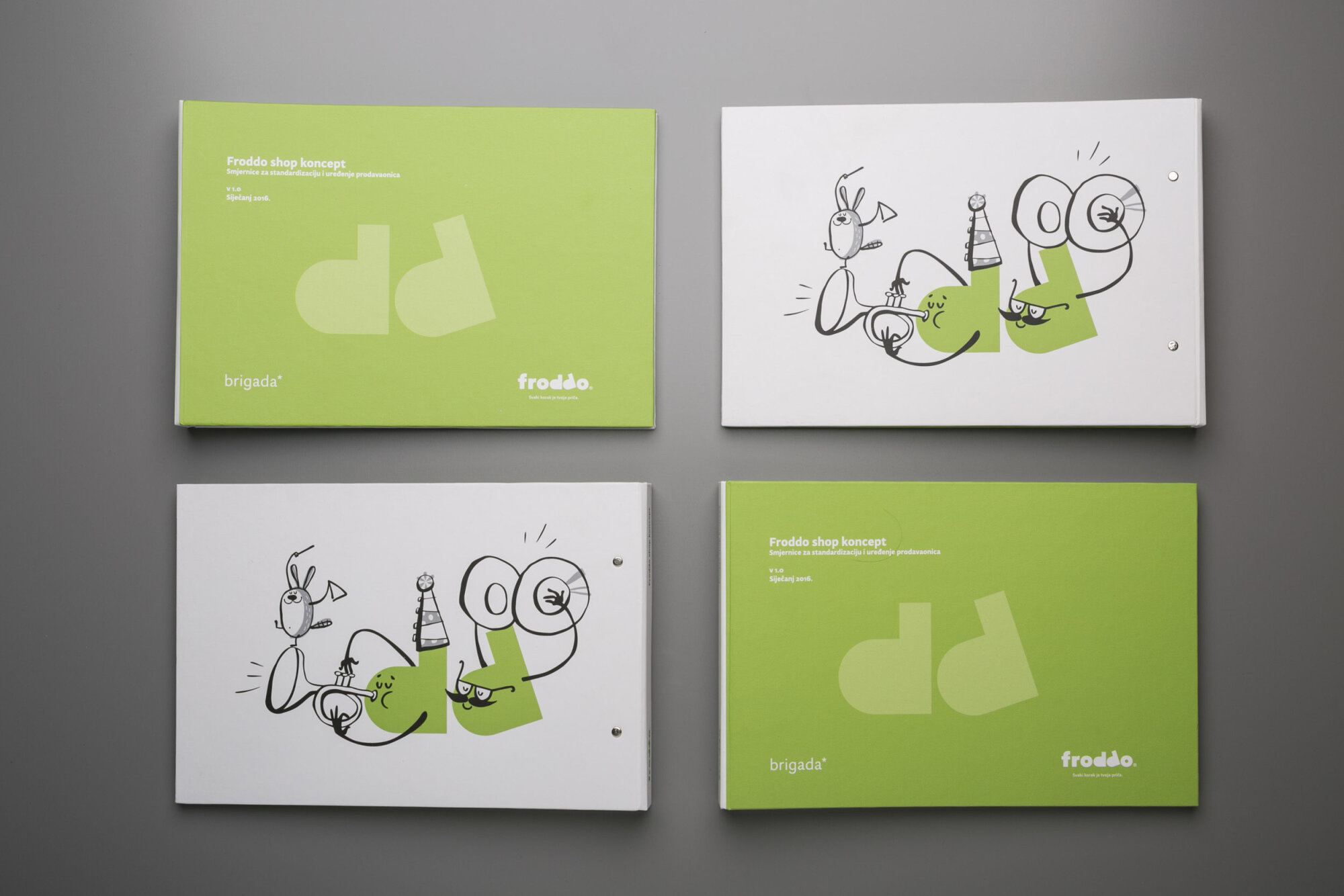 In line with our redesigned retail concept, we aimed to ensure that all Froddo stores have a uniform design. To achieve this, we've developed a store manual that contains guidelines for the standardisation of the shop design. The front cover features a light blend of green and white colours, with a playful cartoon character from the Froddo story on the back, symbolising the essence of our store design and brand experience.