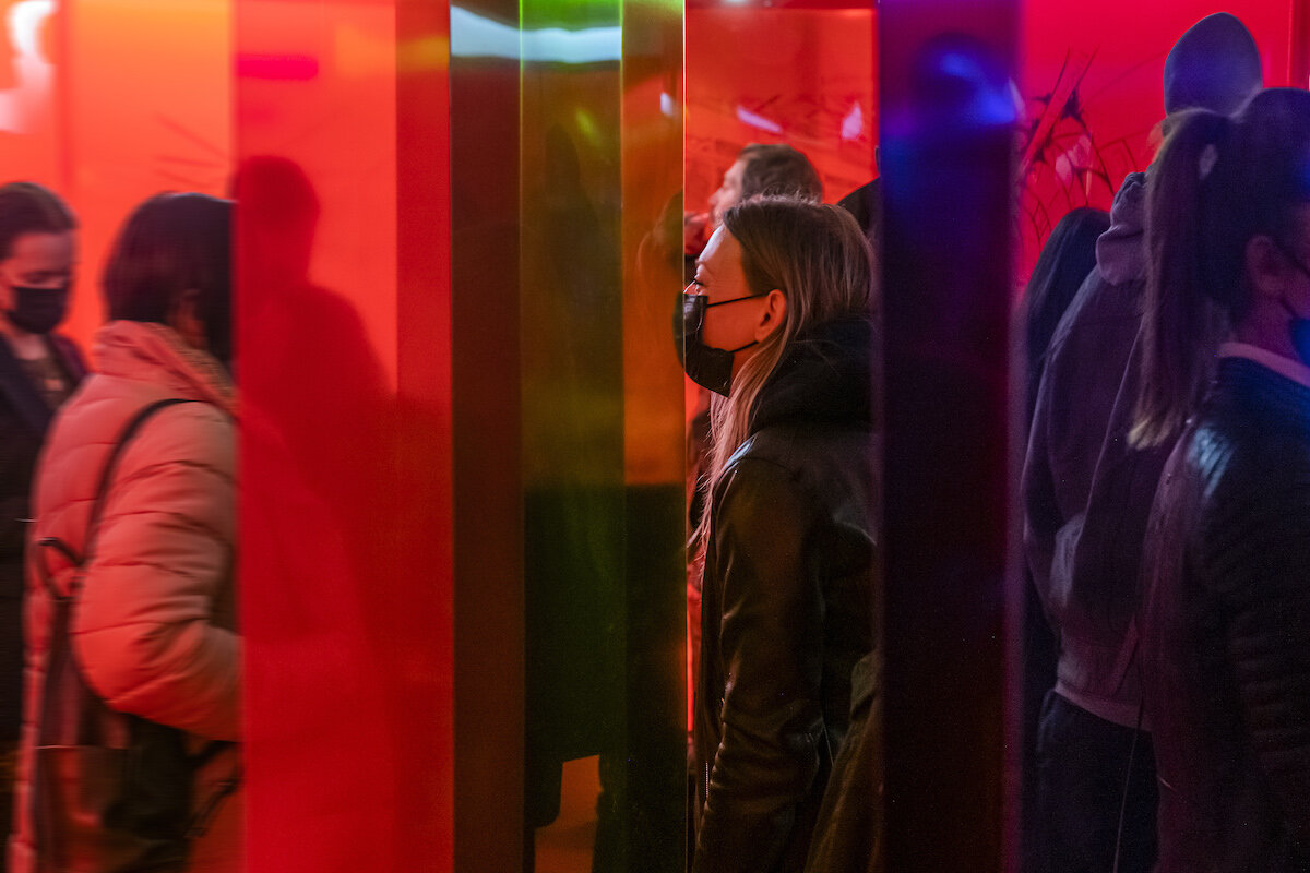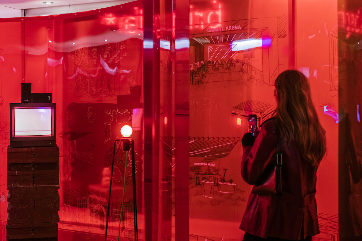 Thus, for this occasion, we enveloped the entire gallery space with red transparent foils adorned with hand-drawn representations of Brigada's projects. With a special audio backdrop, we created an experience of creative yet structured chaos.