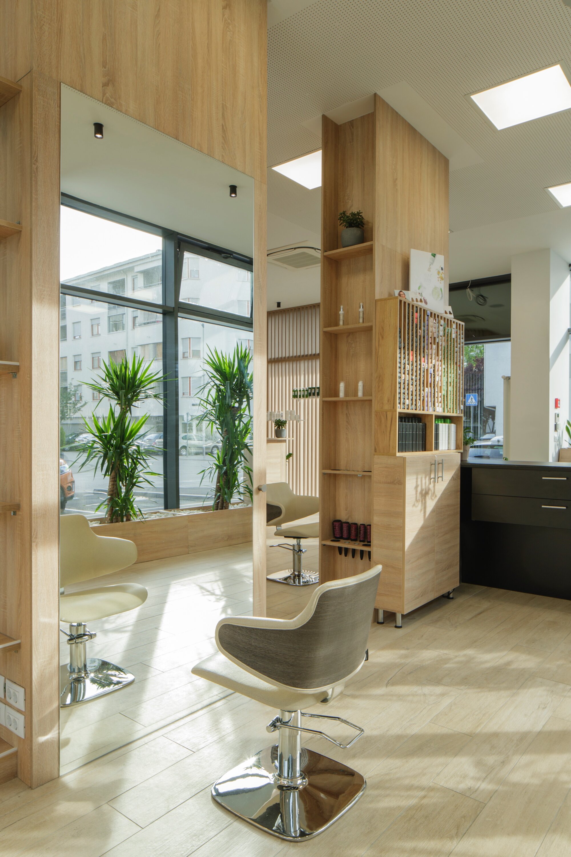 The entrance area comprises a reception desk, shelves for displaying hair products, and a lounge where clients can receive professional advice on selecting the right products. The front area is separated from the rest of the space by the colour bar, where consultations and the final mixing of hair dyes take place. The workstations, each equipped with a full length-mirror, are separated one from another by shelves and small aisles.