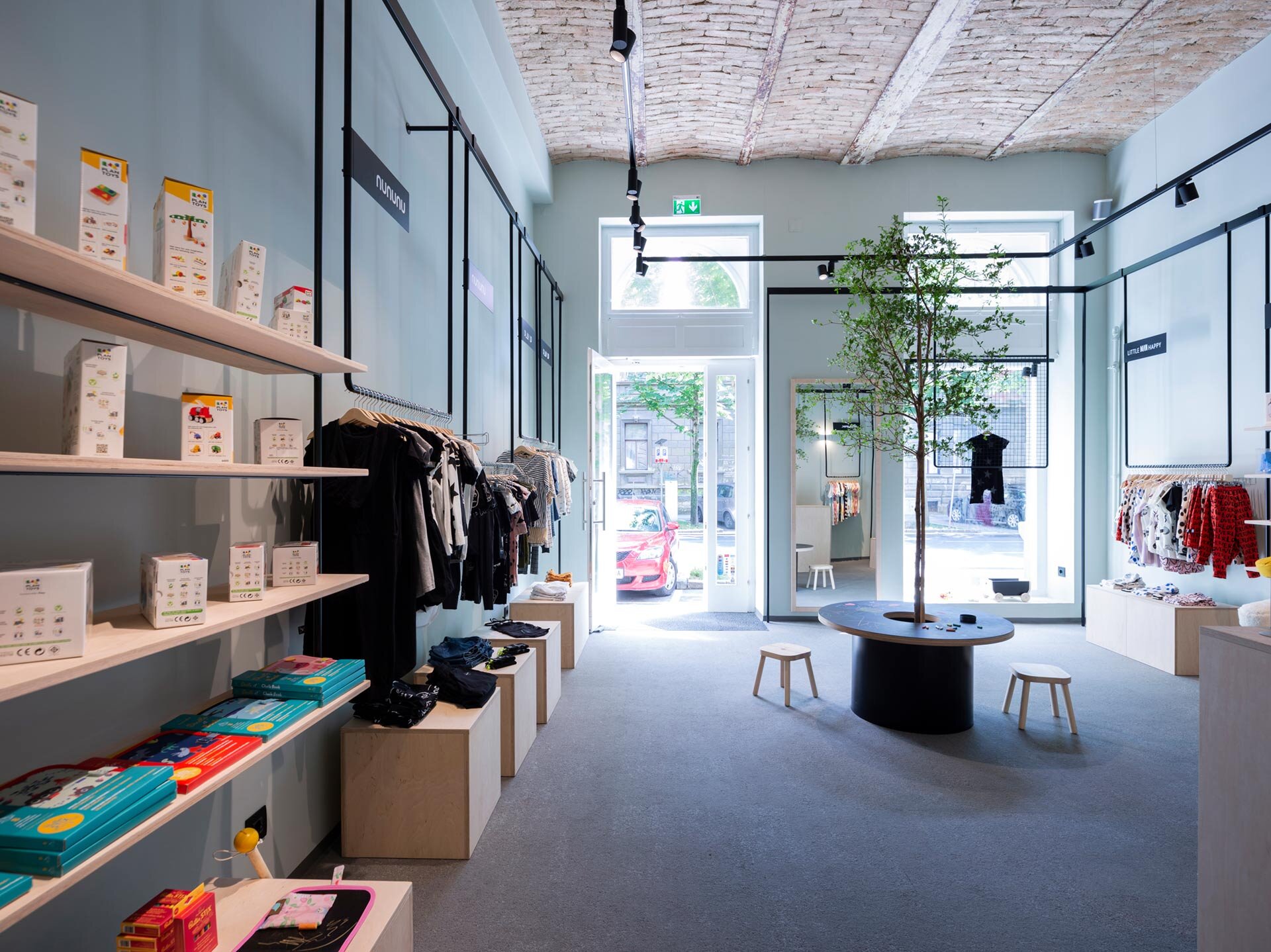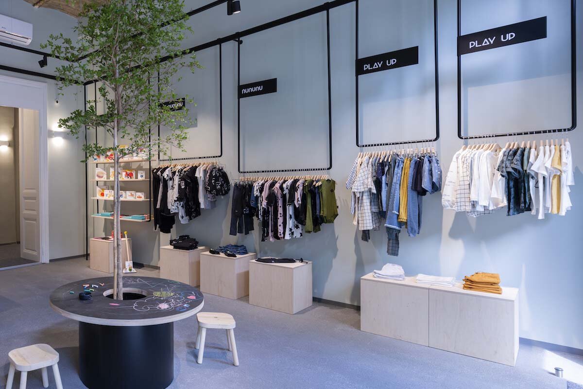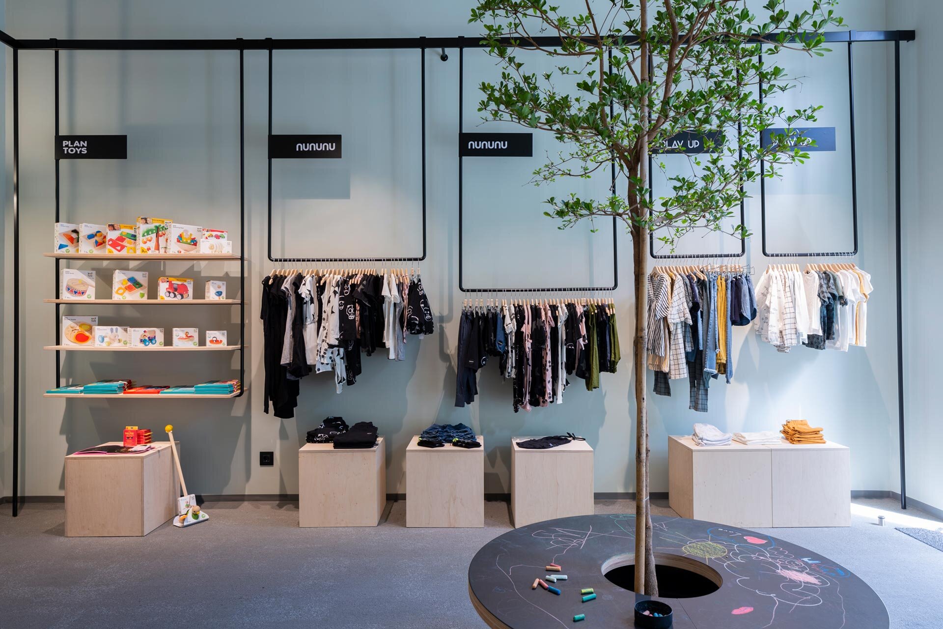 The interior lacks the typical children's decor, but abstract forms featured in the store can inspire their imaginations even more. A wooden box isn't just a shelf, it's also a toy house, a chair, a wardrobe, or who knows what else kids might imagine when they enter a world with a tree growing in the middle of an indoor space.