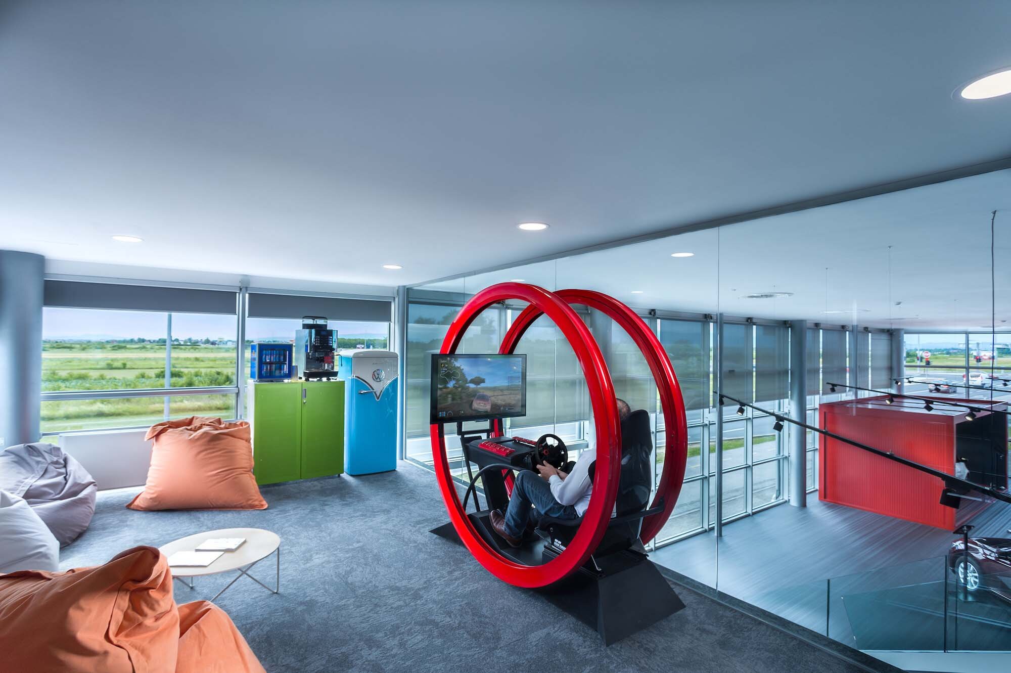 The exterior design of the building mirrors the shape of the logo, serving as a distinctive spatial marker that dominates its location. These modular buildings are adaptable, coming in two or three parts, either freestanding or integrated into existing architecture, depending on the specific land lot. The interior space is divided into several units, including an area for car examinations, a waiting room, and a sales office.
