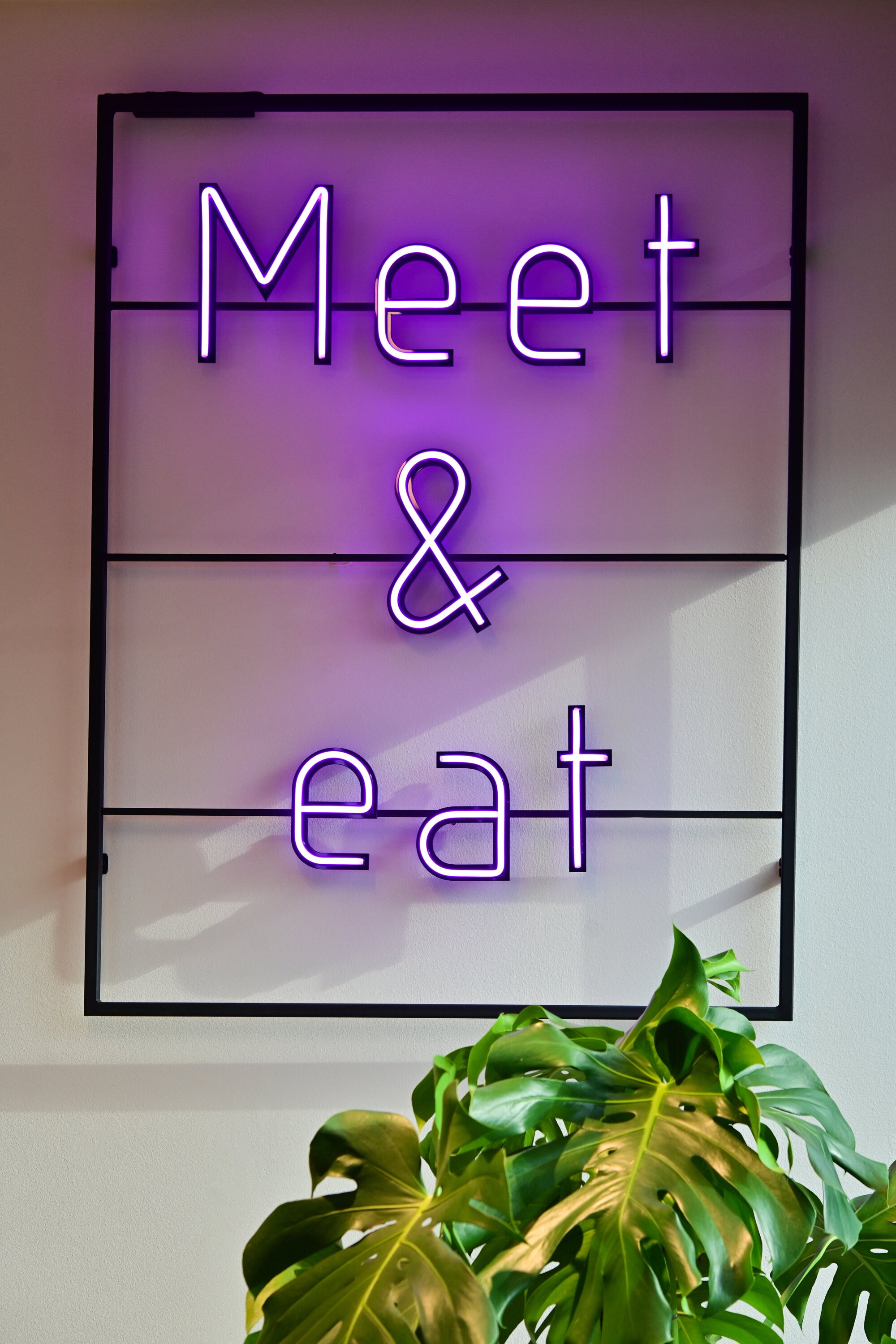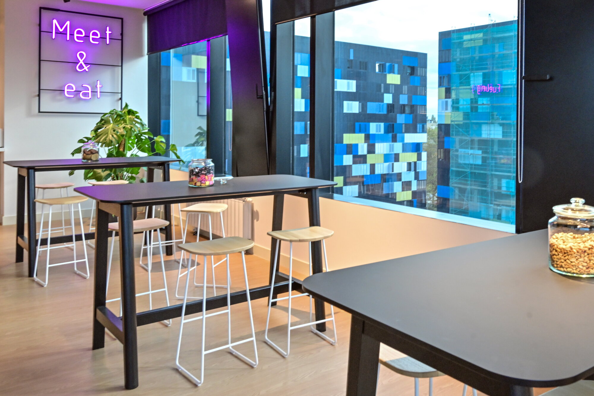 At the core of the office lies the social hub – the Fueling Station. As the largest room on the floor, it offers a space for employees to relax, enjoy lunch, or simply socialize. The room's ambiance is enhanced by expansive glass walls providing a breathtaking city view, aligning with our ultimate goal of creating an exceptionally relaxing environment. Subtle, unobtrusive furniture with soft lines contributes to an open and fluid space. Character is infused through understated details in Productive's colors and dynamic wallpaper sourced from Japan, changing hues with shifting light.