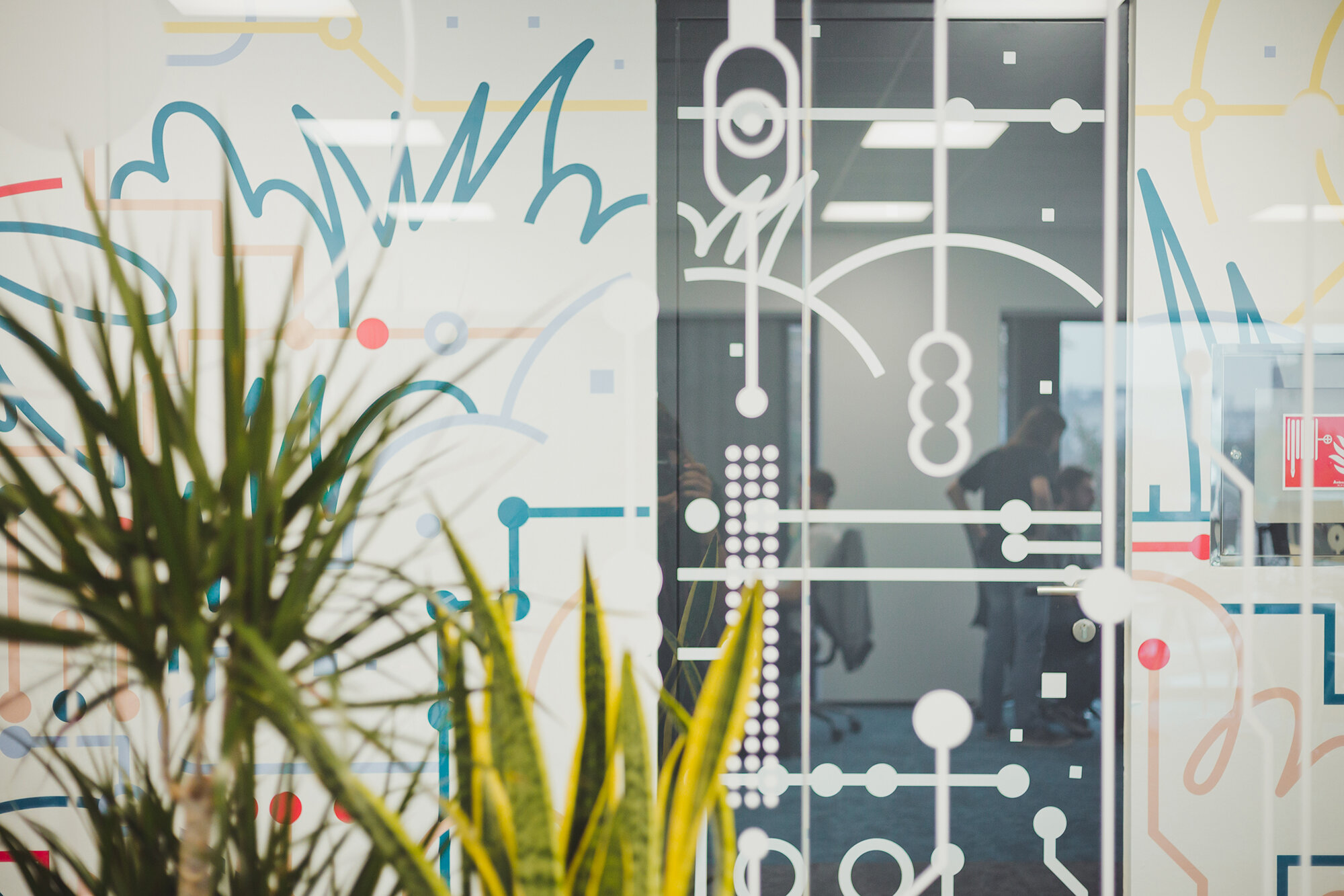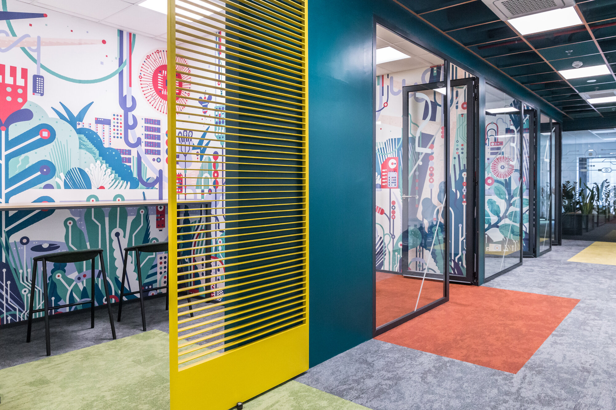 Wall graphics were developed in collaboration with the design team of ReversingLabs, enhancing the cyber landscape with vibrant colours, lines, and motifs inspired by beloved heroes like Spock and Neo. Cyber palm trees blend seamlessly with real office plants, making the workspace more inviting. While the cyber jungle concept extends through common areas and communication spaces, the enclosed offices adopt a more subdued design, ideal for concentration and focused work. Nevertheless, employees still have glimpses of the lush jungle and foliage through glass walls.