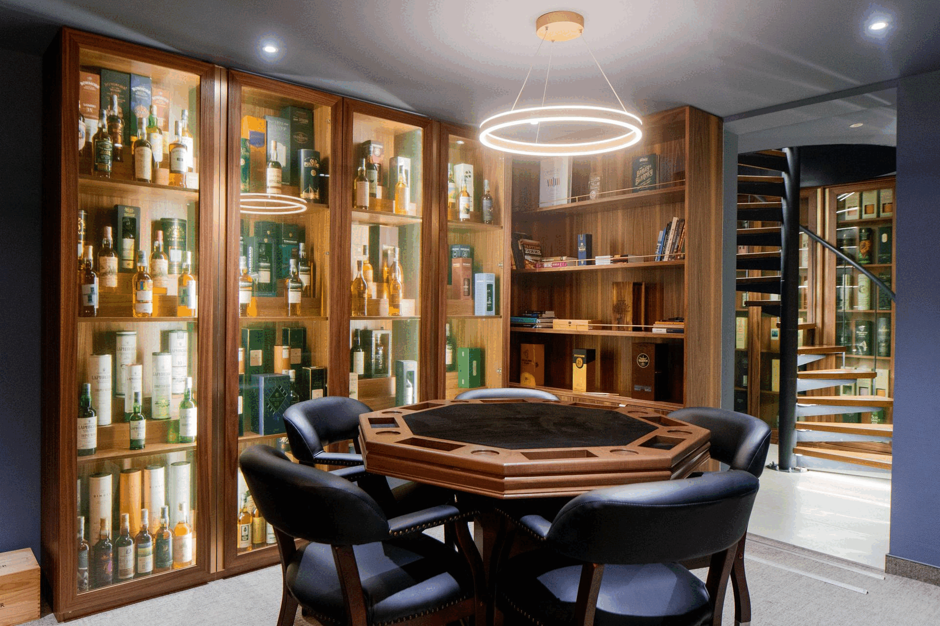 The social area and whiskey bar are concealed behind a hidden automated sliding bookshelf, with a circular staircase leading down to the basement. This staircase is flanked by custom-built shelves that house an extensive collection of rare and limited-edition whiskey bottles.