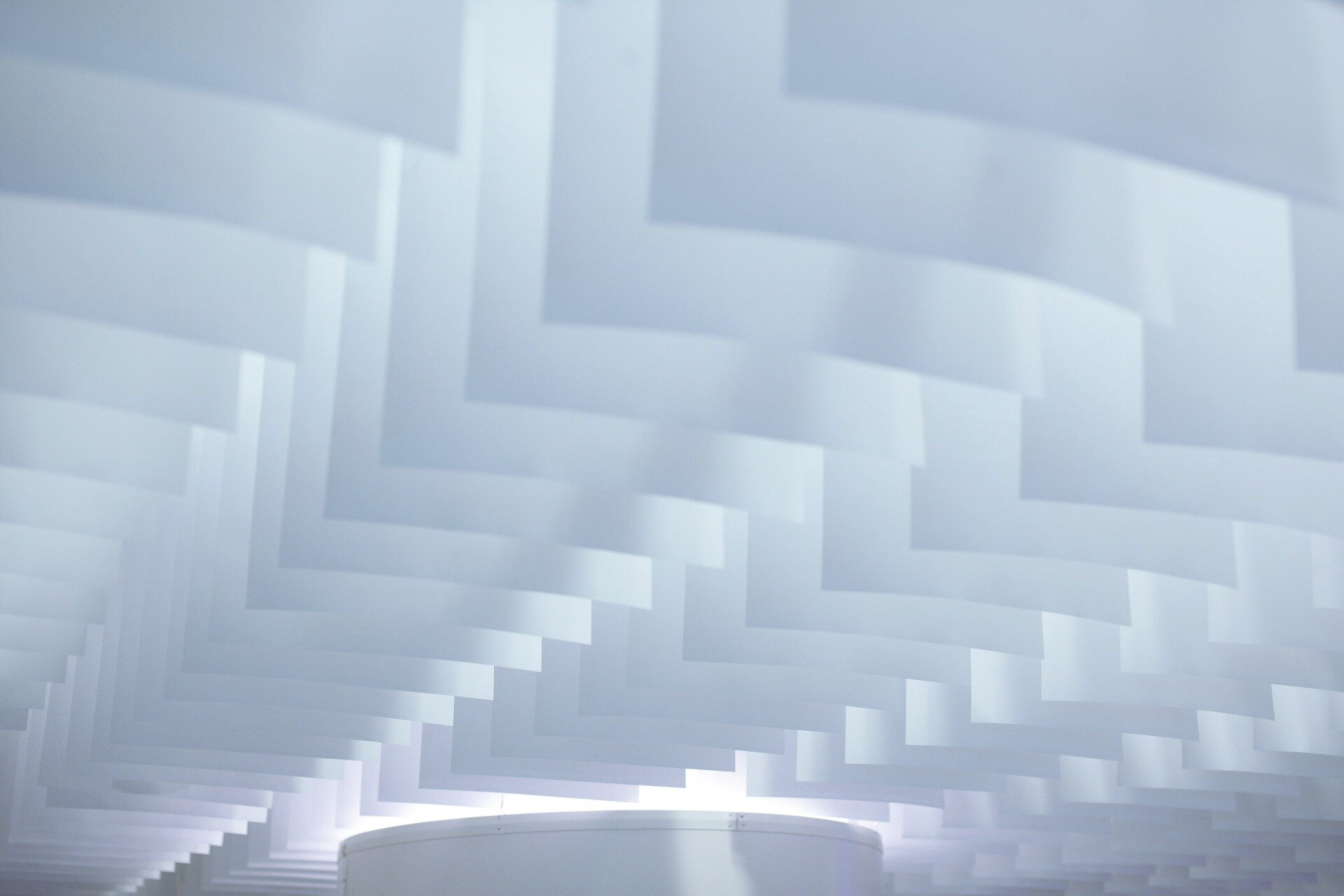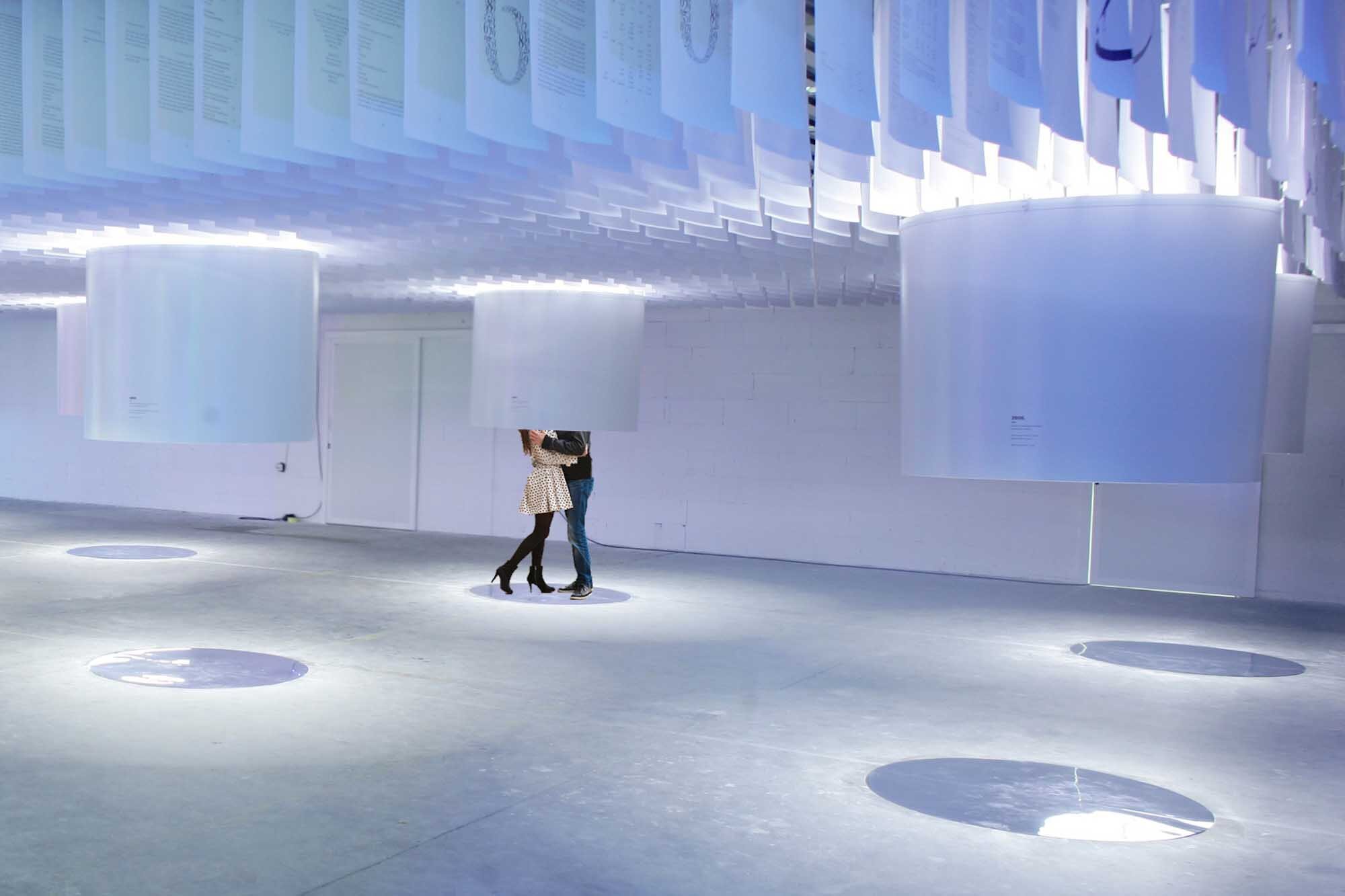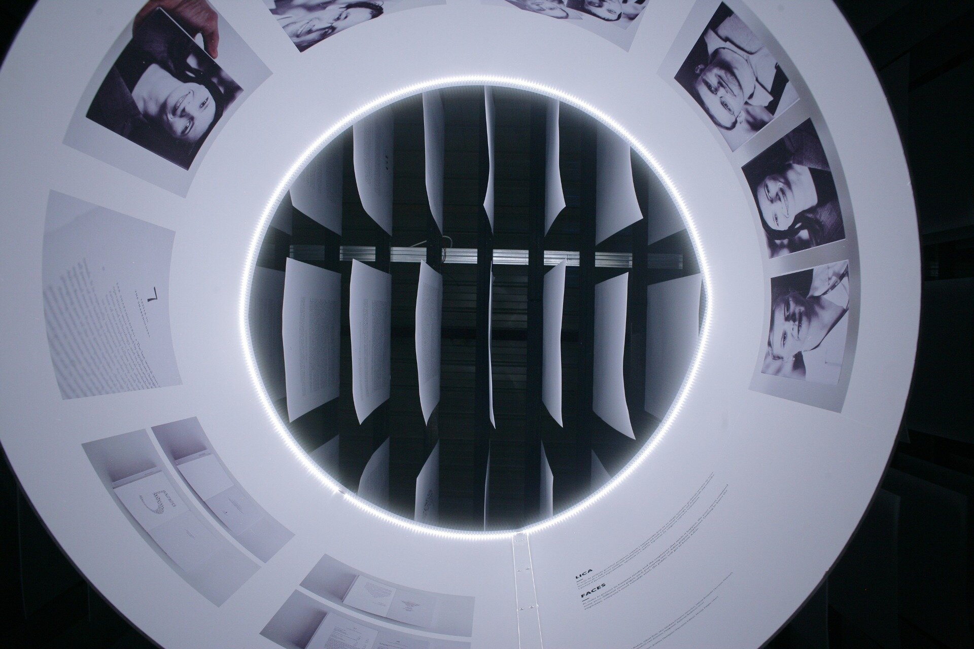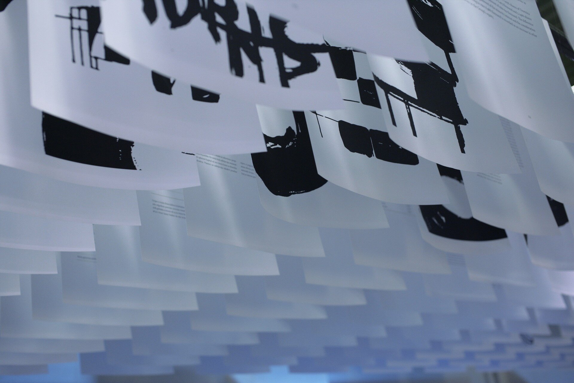 The ceiling of the pavilion was filled with hundreds of enlarged, printed pages from all ten annual reports that, suspended from a specially devised substructure, created a unique texture evocative of the tobacco leaves that used to hang in the space while drying. Light filtering through the sheets of paper created a “dematerialization” of the ceiling surface while at the same time allowing visitors to study whichever page caught their interest.