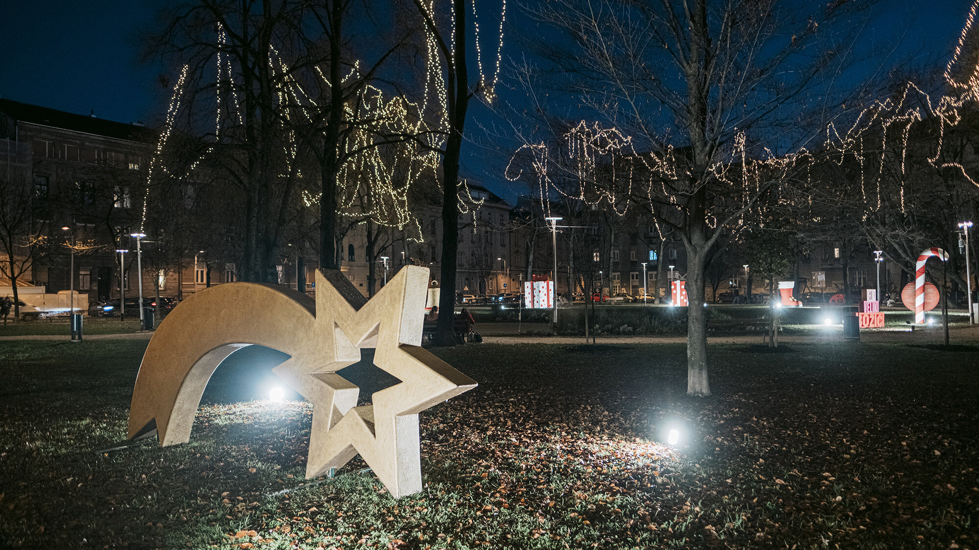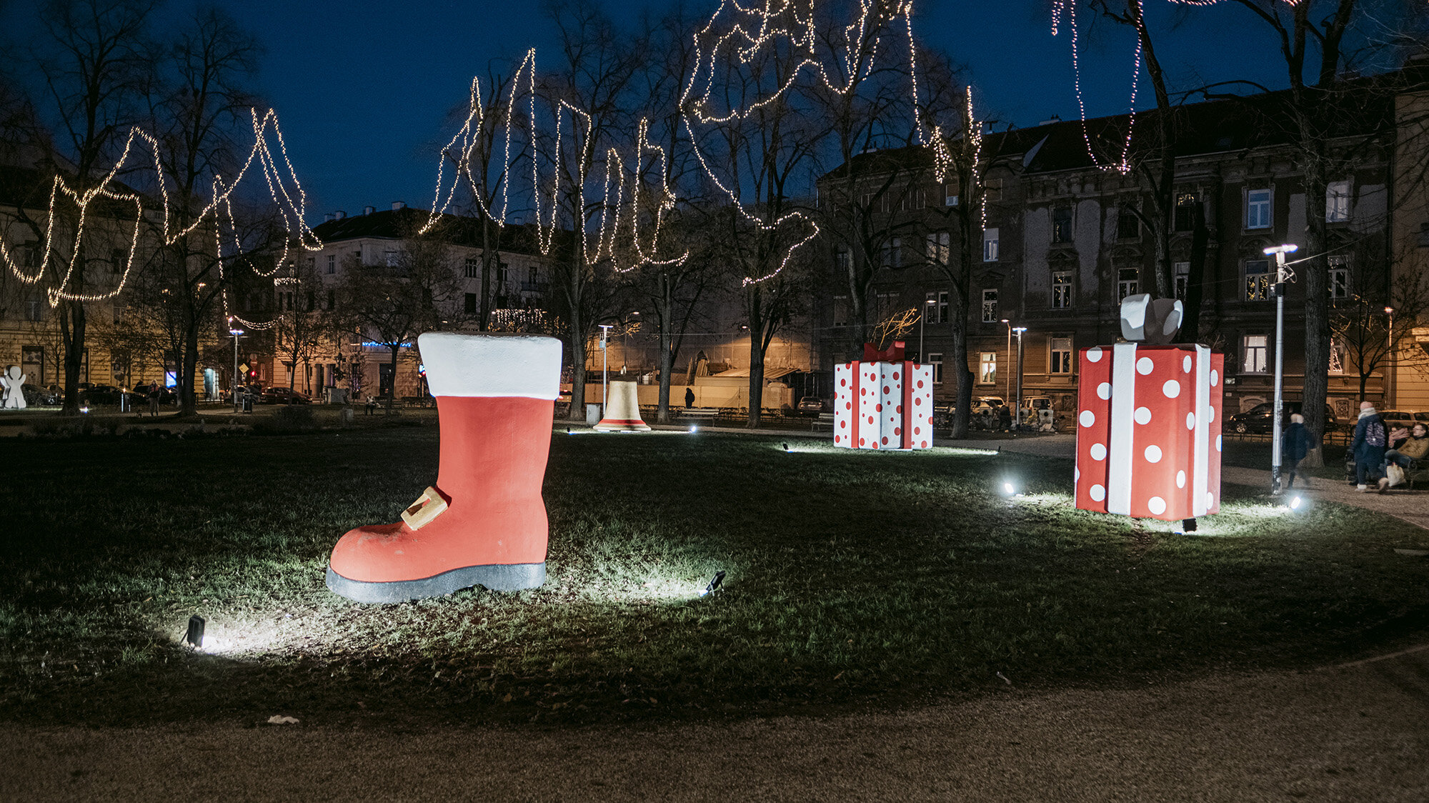 The first of the two selected locations is Svačić Square, chosen to create a warm Advent atmosphere in a completely new setting. The desired atmosphere was achieved by placing eight oversized sculptures of Christmas motifs, leading to the location being named "Big Big Christmas." Two sculptures of gifts, shooting stars, Christmas tree ornaments, candy canes, boots, bells, and a Christmas cookie were designed, constructed, and installed. The biggest challenge was to construct and transport huge sculptures made of styrofoam blocks, including a shooting star that is four meters tall, and a larger gift sculpture weighing over 300 kilograms. The lengthy process of creation took two months, requiring the use of cranes to place the sculptures in the desired locations. This fairytale-like location is primarily intended for the youngest population, but there is no doubt that even the older ones will be thrilled.