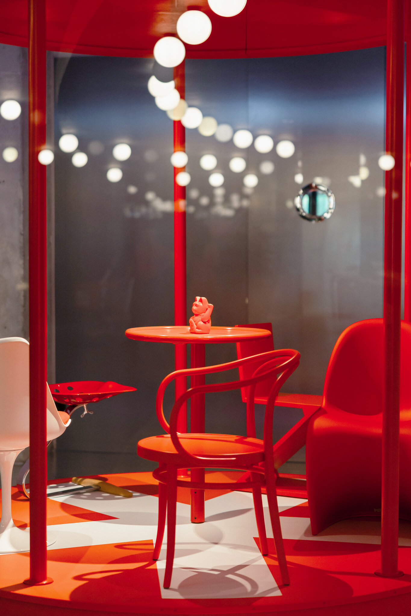 The installation takes the form of a carousel that guides visitors through five milestones in furniture design: Ton No. 30 (1859), Zig Zag (1934), Tulip (1956), Mezzadro (1957), and Panton (1967).