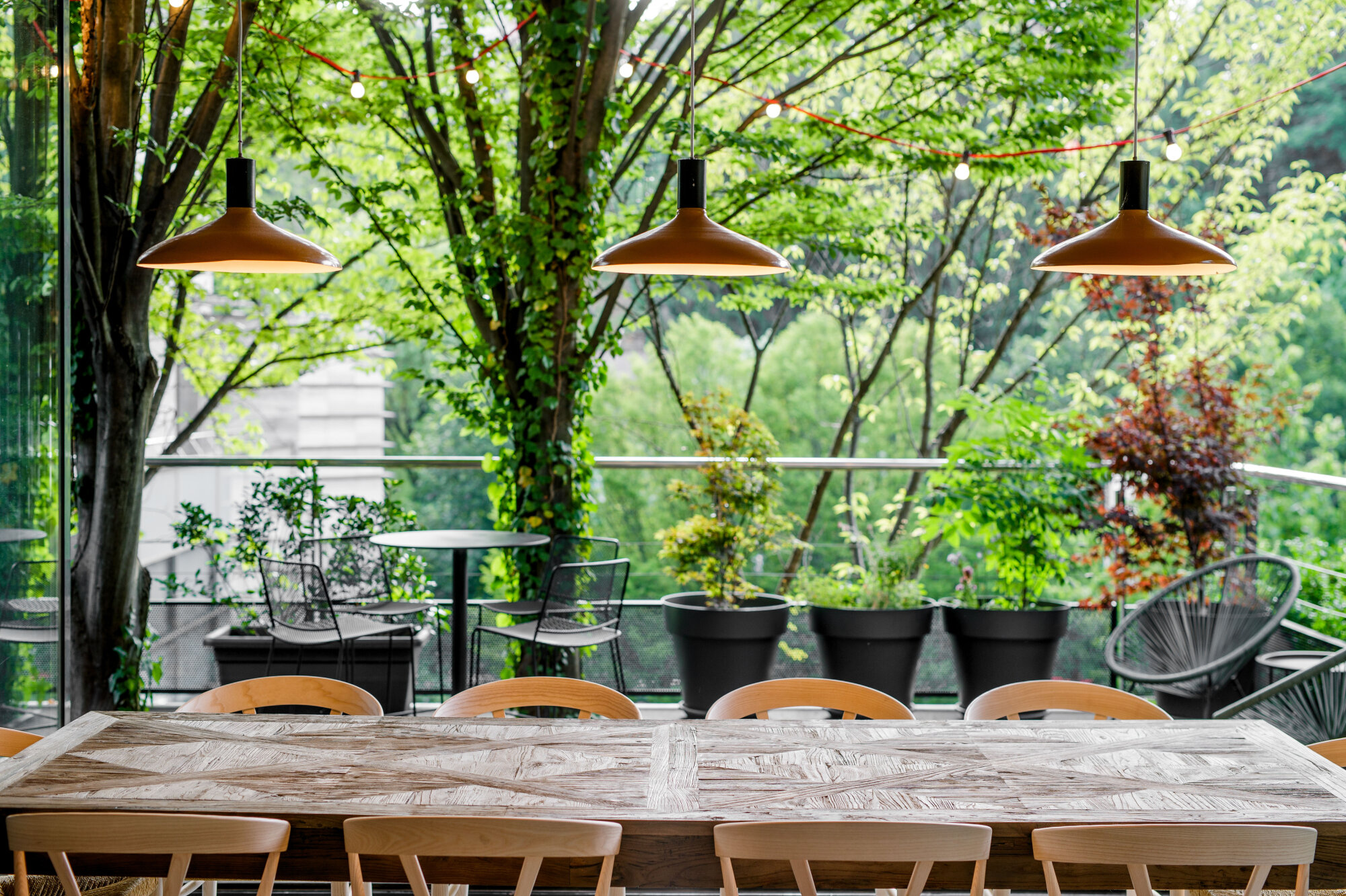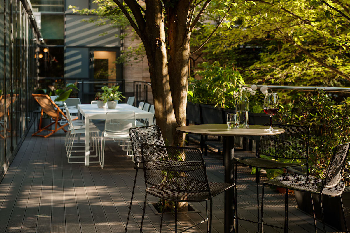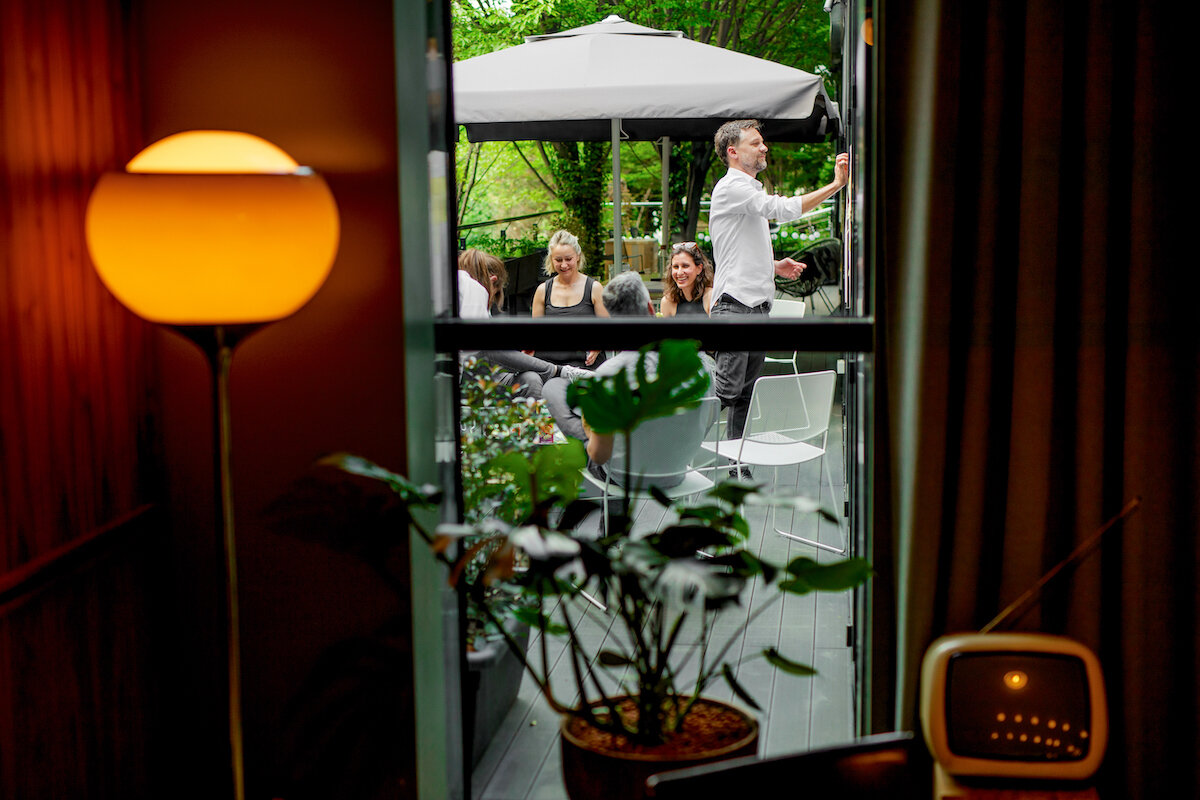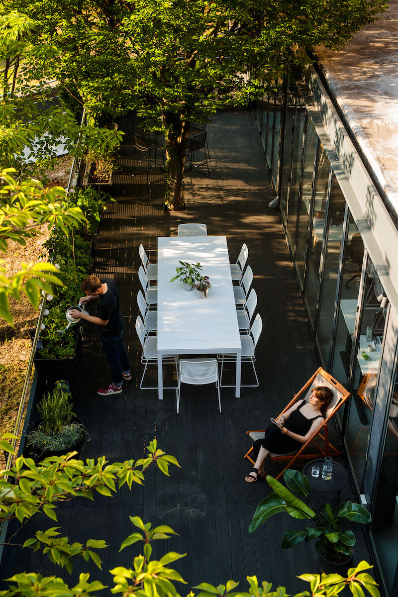 A hidden door separates the showroom from the office area, and the sole hint of what is behind the door is a porthole through which one can catch a glimpse of the agency’s working atmosphere. The workspace is defined by a large glass wall that opens towards the terrace and the surrounding greenery, which thus become an integral part of the interior. In addition to the workstations, an essential element of the workspace is a large library with patterns, professional literature, and panels for mood boards and the elaboration of design processes. The linearly designed interior ends with a kitchen and a dining room that open onto the terrace, which acts as an alternative workspace, a summer dining room, and a garden where the agency’s employees grow organic vegetables and herbs.