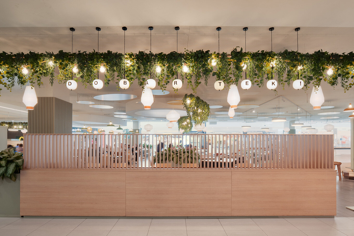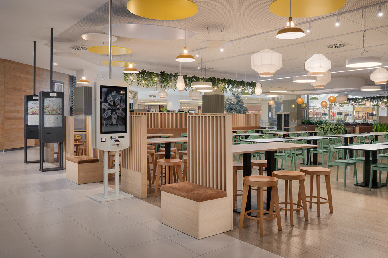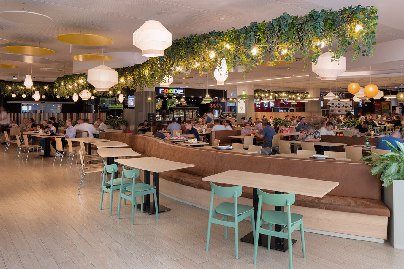 By incorporating distinctive design elements, the space is transformed into an inviting indoor courtyard where people can relax, connect, and enjoy food and drinks together, much like the lively ambiance of a market or street food event. Abundant greenery and string lights enhance the sense of warmth and vibrancy, turning the Foodcourt into a destination in itself – not just a place to eat, but a unique brand experience.
