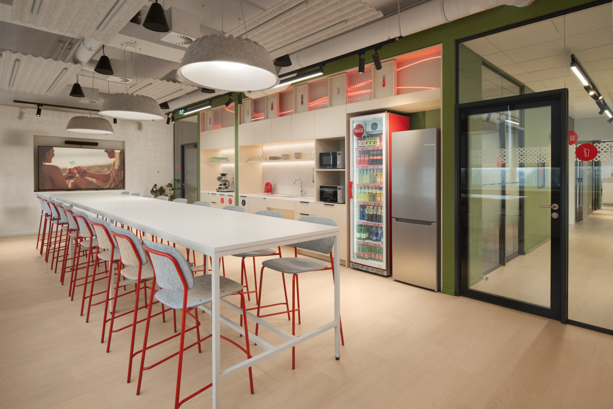 The Coca-Cola Adria office in Zagreb showcases a thoughtful approach to modern workplace environments, emphasizing quality, functionality, and employee wellbeing. The space is carefully crafted to achieve a harmonious balance between warm tones and accent colors, creating a welcoming yet professional atmosphere.