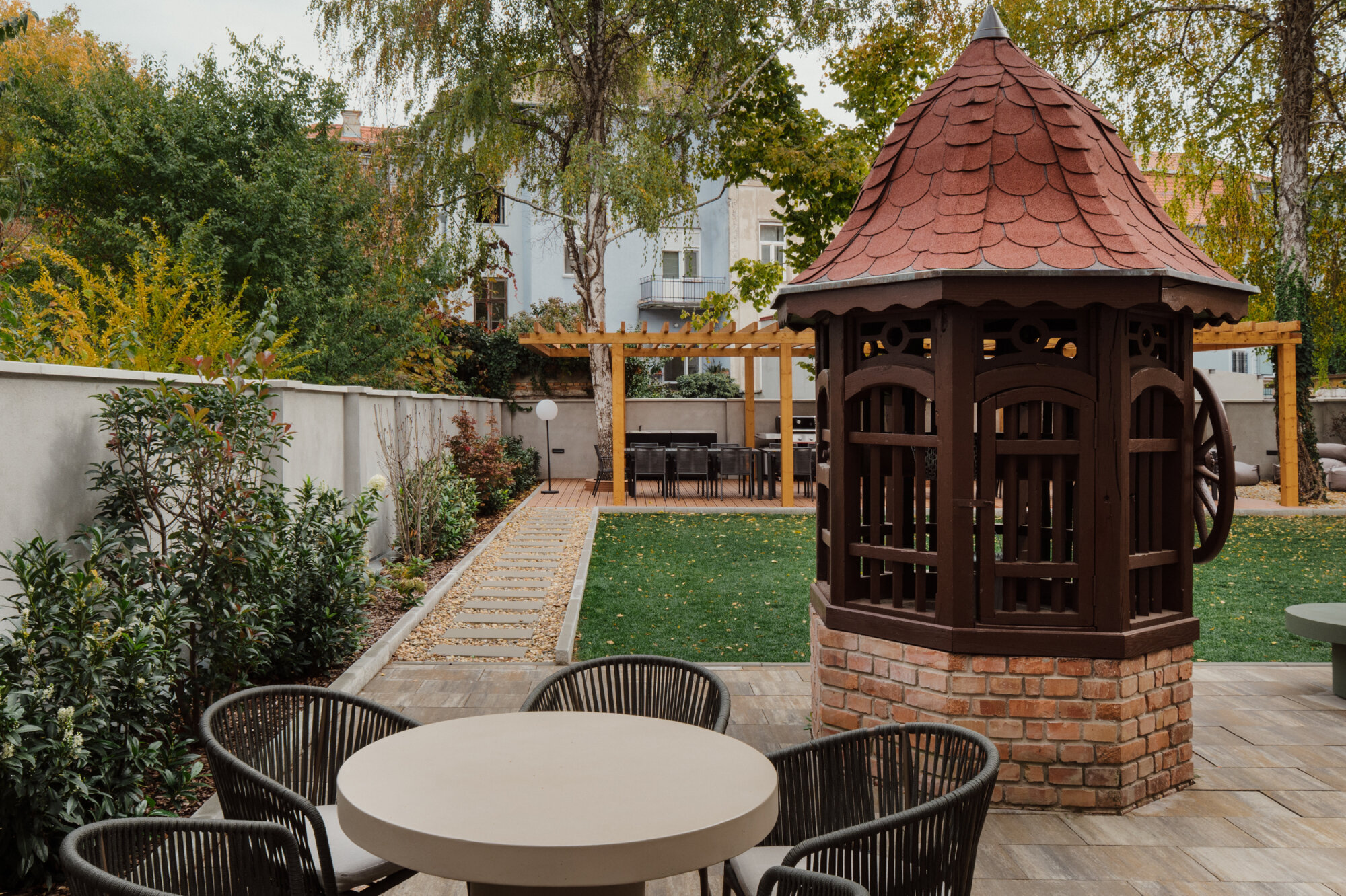 The working areas were kept simple, with a focus on comfort and concentration. At the same time, particular value is placed on the outdoor garden - a green oasis with a wooden pergola that provides shade and a sense of calm. The basement adds another distinctive layer to the project, transformed into the DICE Club - a shared dining area and a space for after-work gatherings. Although lower in height and inherently darker in character, it has been enhanced with oval mirrors and ambient lighting, making it unexpectedly inviting and attractive.
