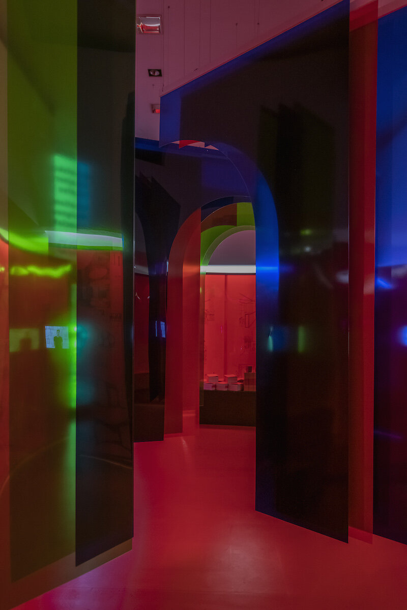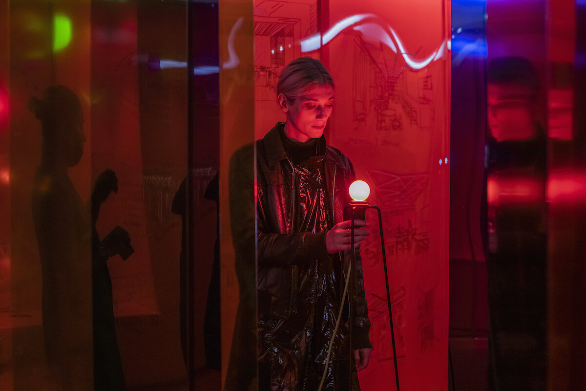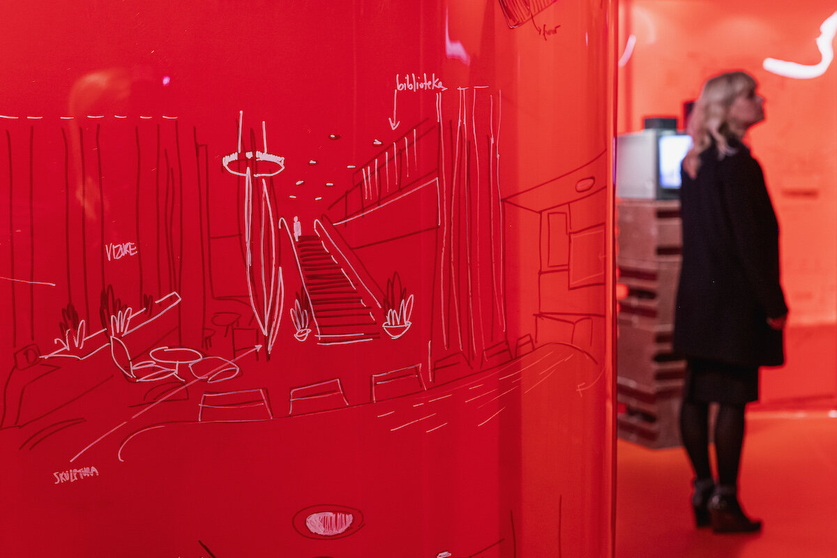 Thus, for this occasion, we enveloped the entire gallery space with red transparent foils adorned with hand-drawn representations of Brigada's projects. With a special audio backdrop, we created an experience of creative yet structured chaos.