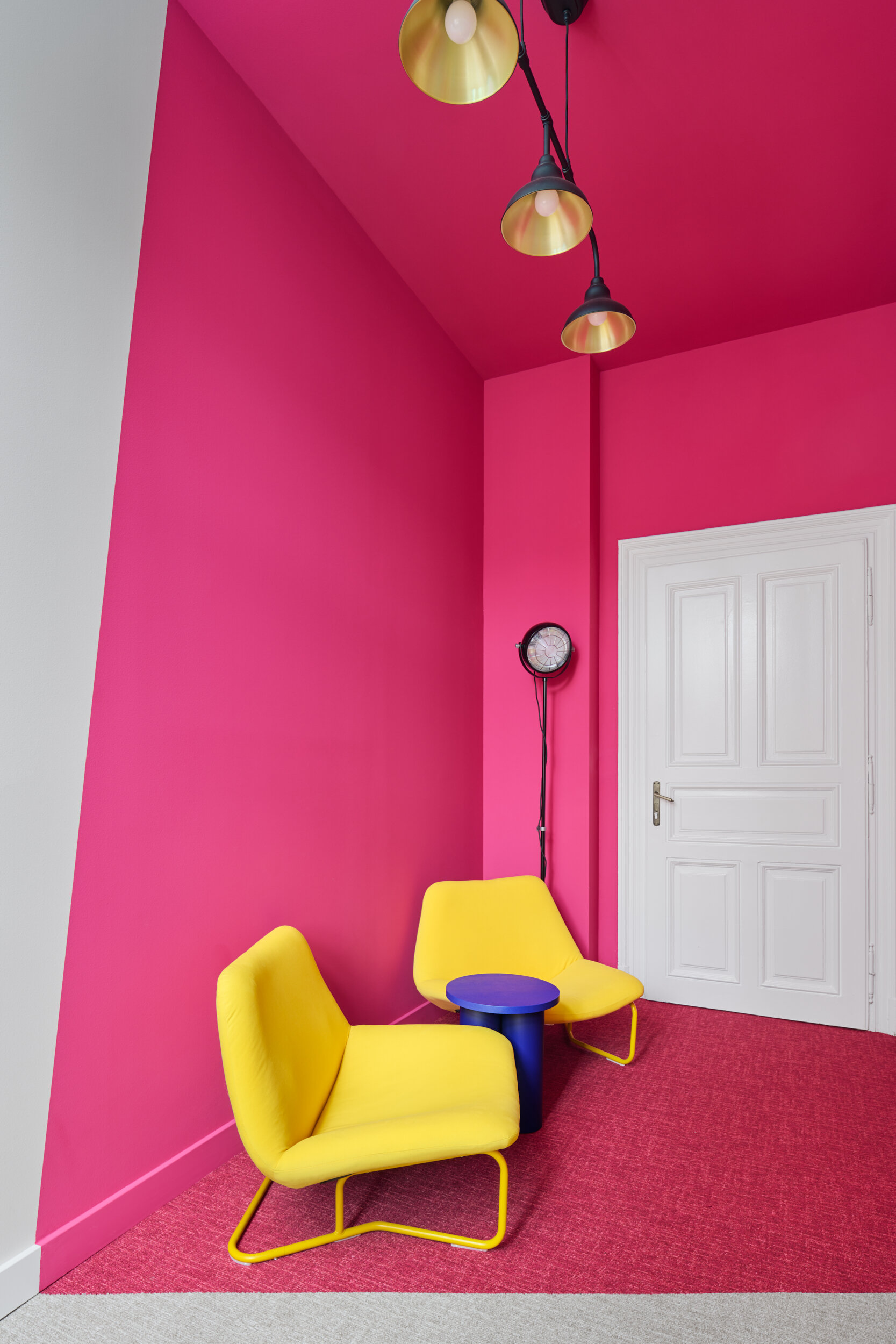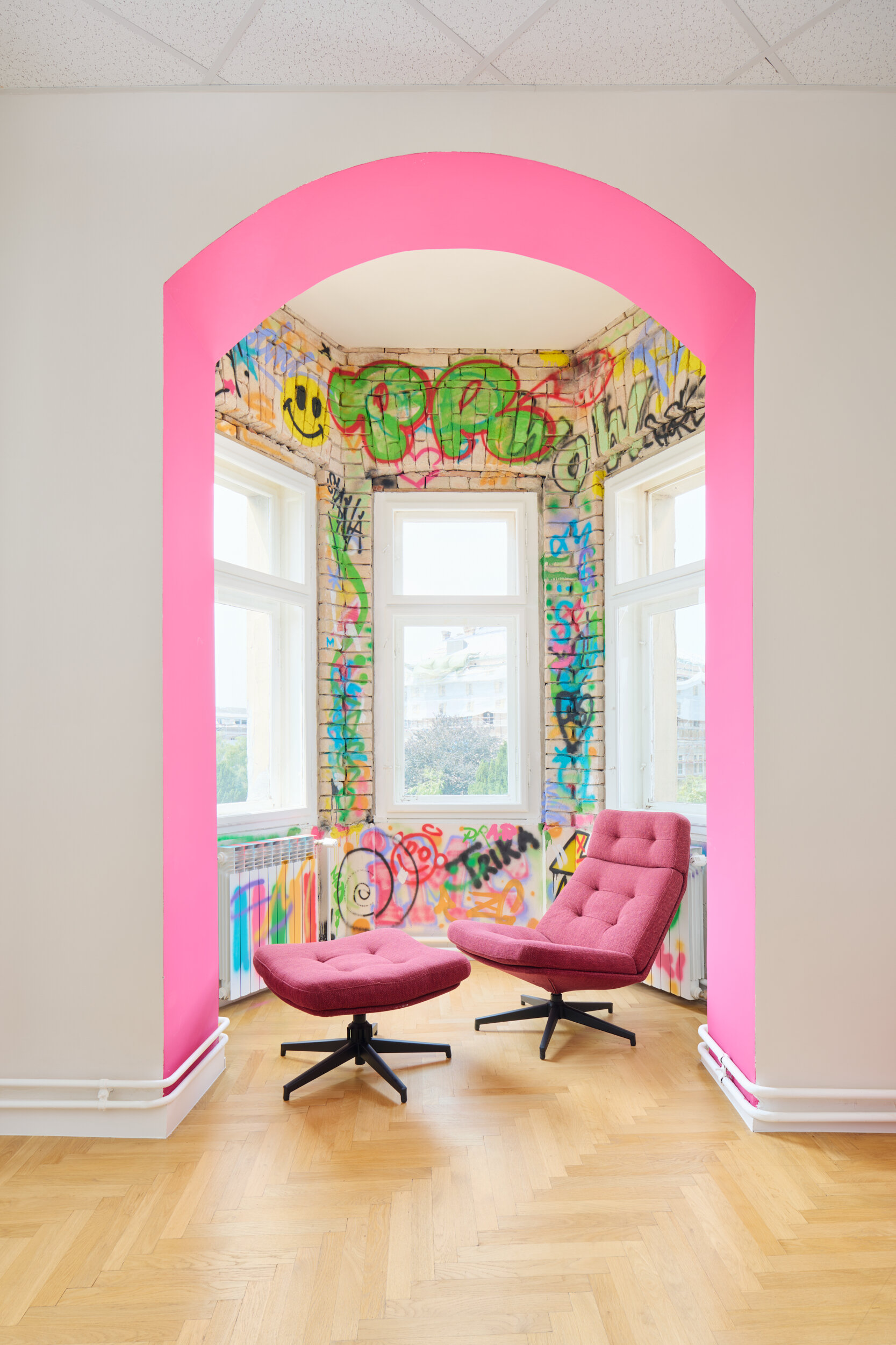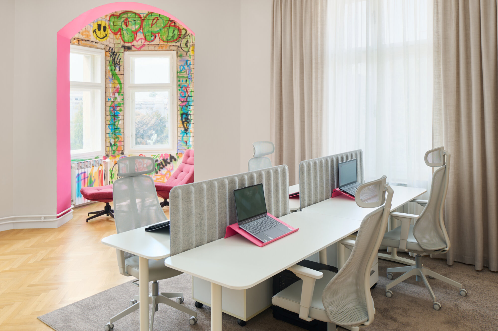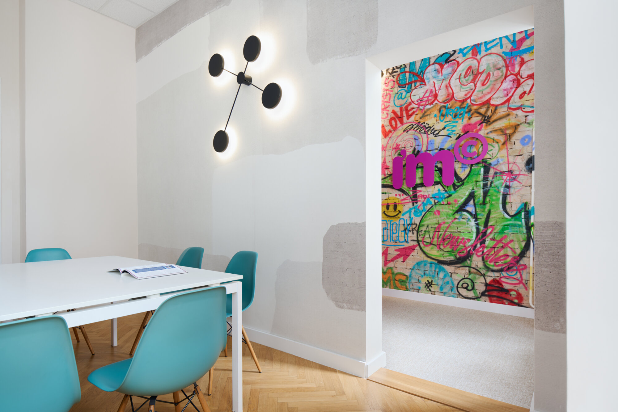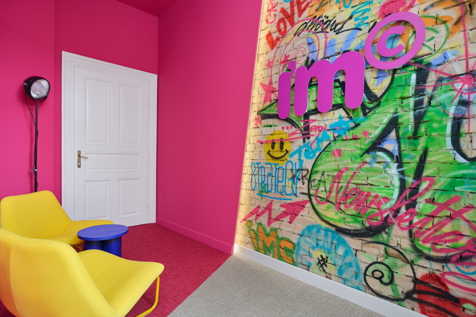 As part of the project, we also designed a special relaxation room for employees, distinctly different from the rest of the space. This playful and unconventional room offers staff a place to unwind, infusing the work environment with creative energy. Special attention was given to integrating IMC’s brand identity into the space. The agency’s signature bold fuchsia color is subtly woven throughout the interior at strategic points, giving the office a distinctive visual identity and making it instantly recognizable.