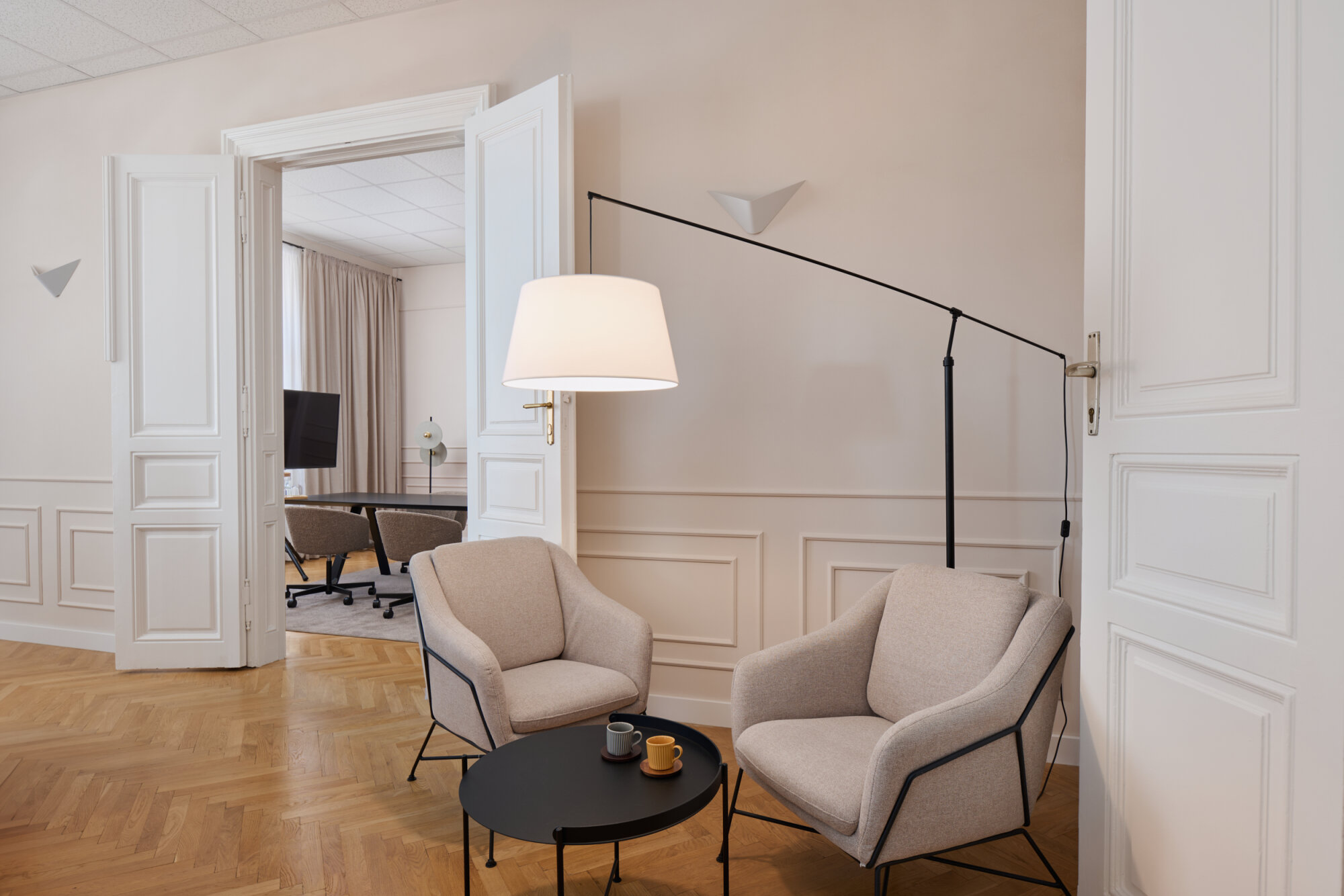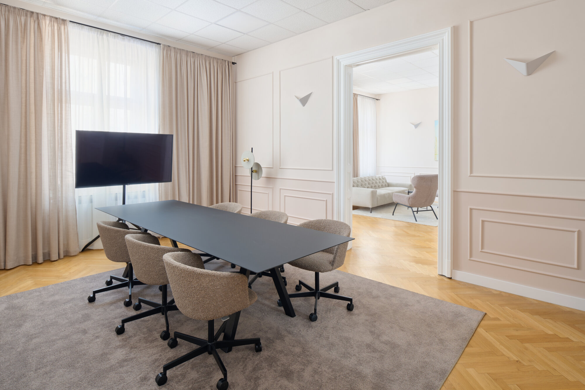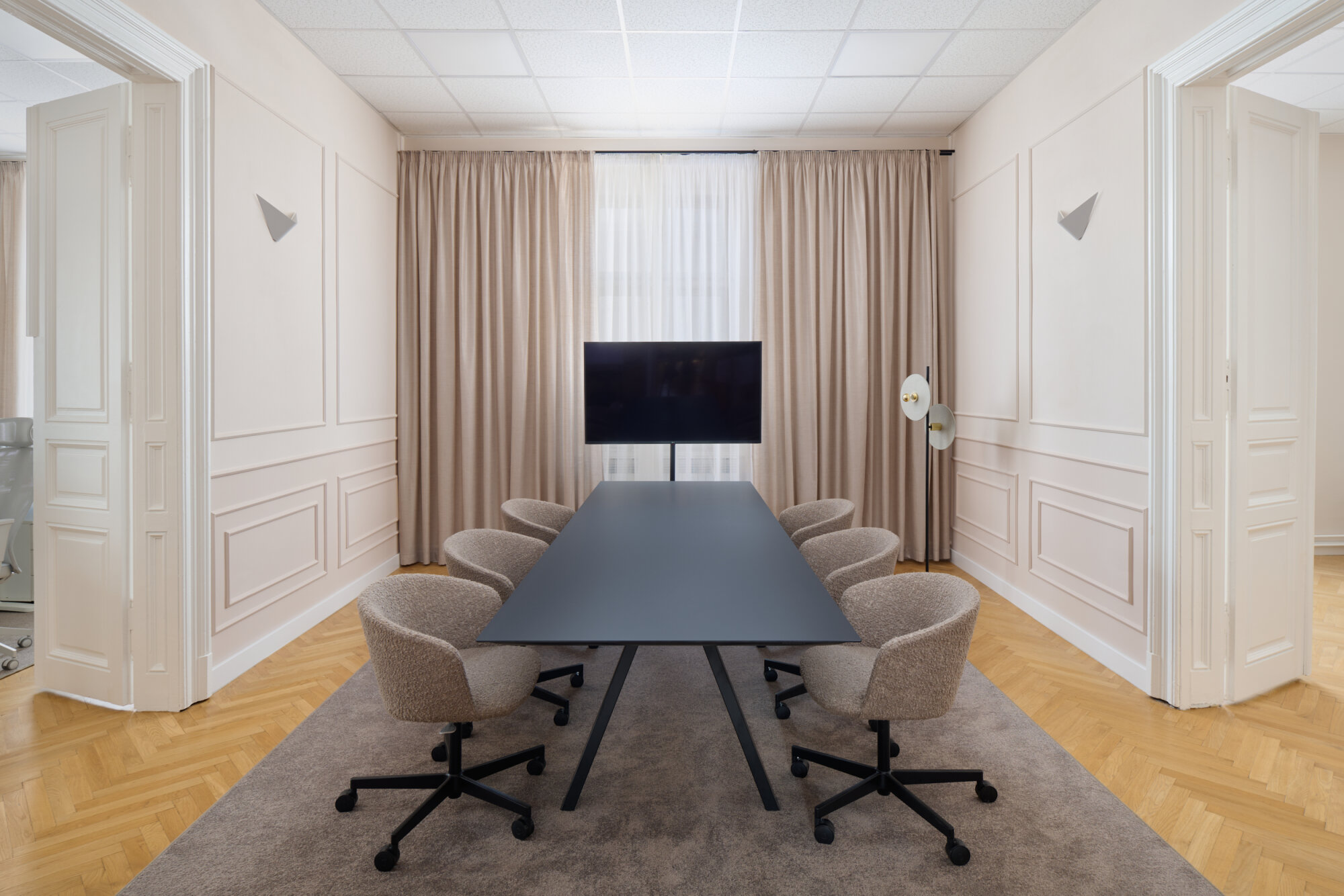 The apartment's key feature, the enfilade, has been preserved and adapted to its new function, while the restored original parquet flooring further enhances the authenticity and warmth of the interior. To modernize the space, we introduced bold contrasts between traditional elements, contemporary interventions, and the existing features. In this spirit, the standard suspended ceiling was retained, adding a touch of office atmosphere in contrast to the softer residential feel.