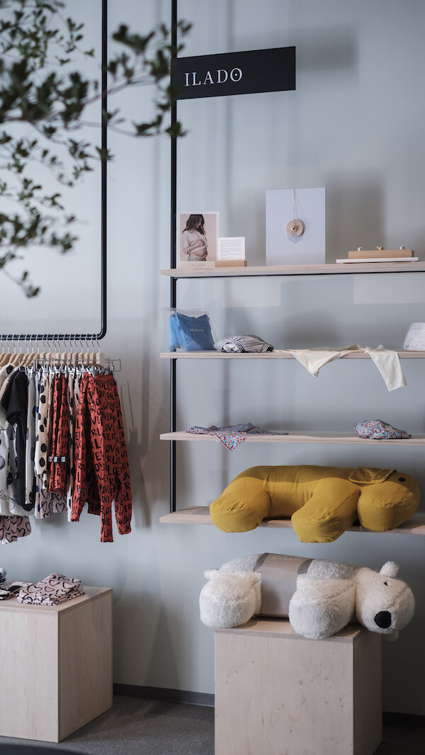 The interior lacks the typical children's decor, but abstract forms featured in the store can inspire their imaginations even more. A wooden box isn't just a shelf, it's also a toy house, a chair, a wardrobe, or who knows what else kids might imagine when they enter a world with a tree growing in the middle of an indoor space.