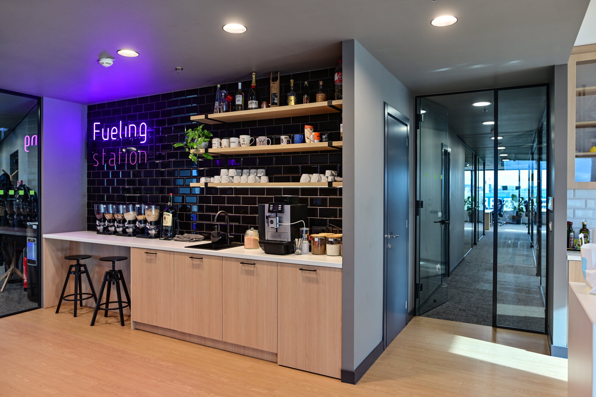 At the core of the office lies the social hub – the Fueling Station. As the largest room on the floor, it offers a space for employees to relax, enjoy lunch, or simply socialize. The room's ambiance is enhanced by expansive glass walls providing a breathtaking city view, aligning with our ultimate goal of creating an exceptionally relaxing environment. Subtle, unobtrusive furniture with soft lines contributes to an open and fluid space. Character is infused through understated details in Productive's colors and dynamic wallpaper sourced from Japan, changing hues with shifting light.