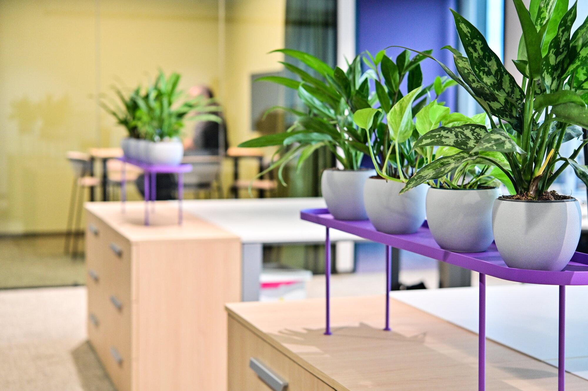 To foster a serene atmosphere conducive to work, we incorporated acoustic panels on specific walls and ceilings to absorb sound. Carpeting spans all areas, and heavy curtains further contribute to noise reduction. Additional elements, such as lighting tailored for warmth in social spaces and a slightly cooler tone in work areas, strategically placed plants for both sound absorption and creating visual and psychological barriers, and a selection of natural colors and shades, were all carefully chosen to soothe without imposing psychological or visual burdens.