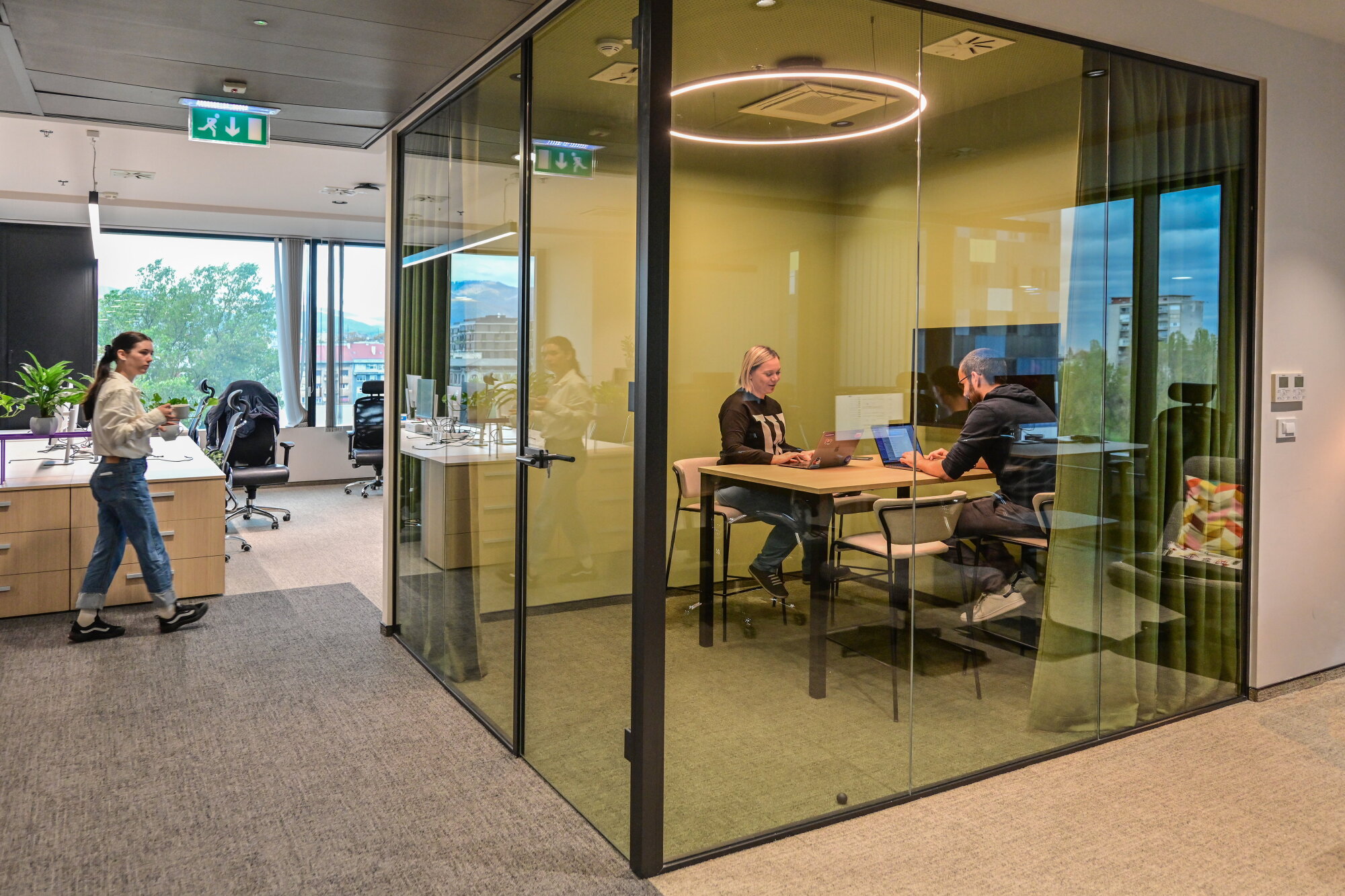 Across this 700m2 area, we focused on incorporating numerous smaller meeting rooms, totaling 10. We eliminated unnecessary walls, introduced new carpets, and enveloped all meeting spaces in glass. Employees collaborate in four expansive open "intermediate spaces," and three enclosed offices serve as meeting rooms when needed.