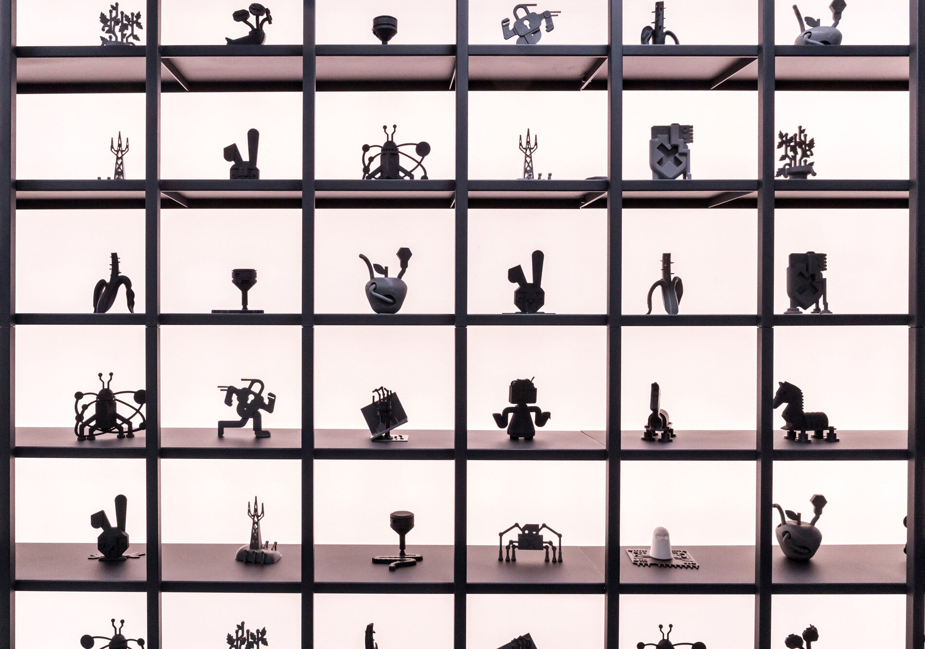 A prominent illuminated metal cage display, featuring 3D-printed representations of malware and digital threats securely contained by the ReversingLabs team, serves as a focal point near the main entrance. Here, you can see pests like Blue Banana, Trojan, Cerberus, and other cyber predators that the team confronts in their daily work.