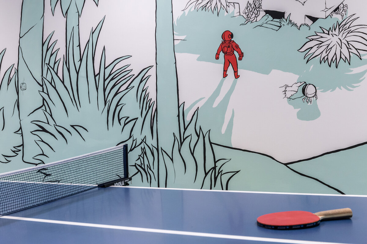 Wall graphics were developed in collaboration with the design team of ReversingLabs, enhancing the cyber landscape with vibrant colours, lines, and motifs inspired by beloved heroes like Spock and Neo. Cyber palm trees blend seamlessly with real office plants, making the workspace more inviting. While the cyber jungle concept extends through common areas and communication spaces, the enclosed offices adopt a more subdued design, ideal for concentration and focused work. Nevertheless, employees still have glimpses of the lush jungle and foliage through glass walls.