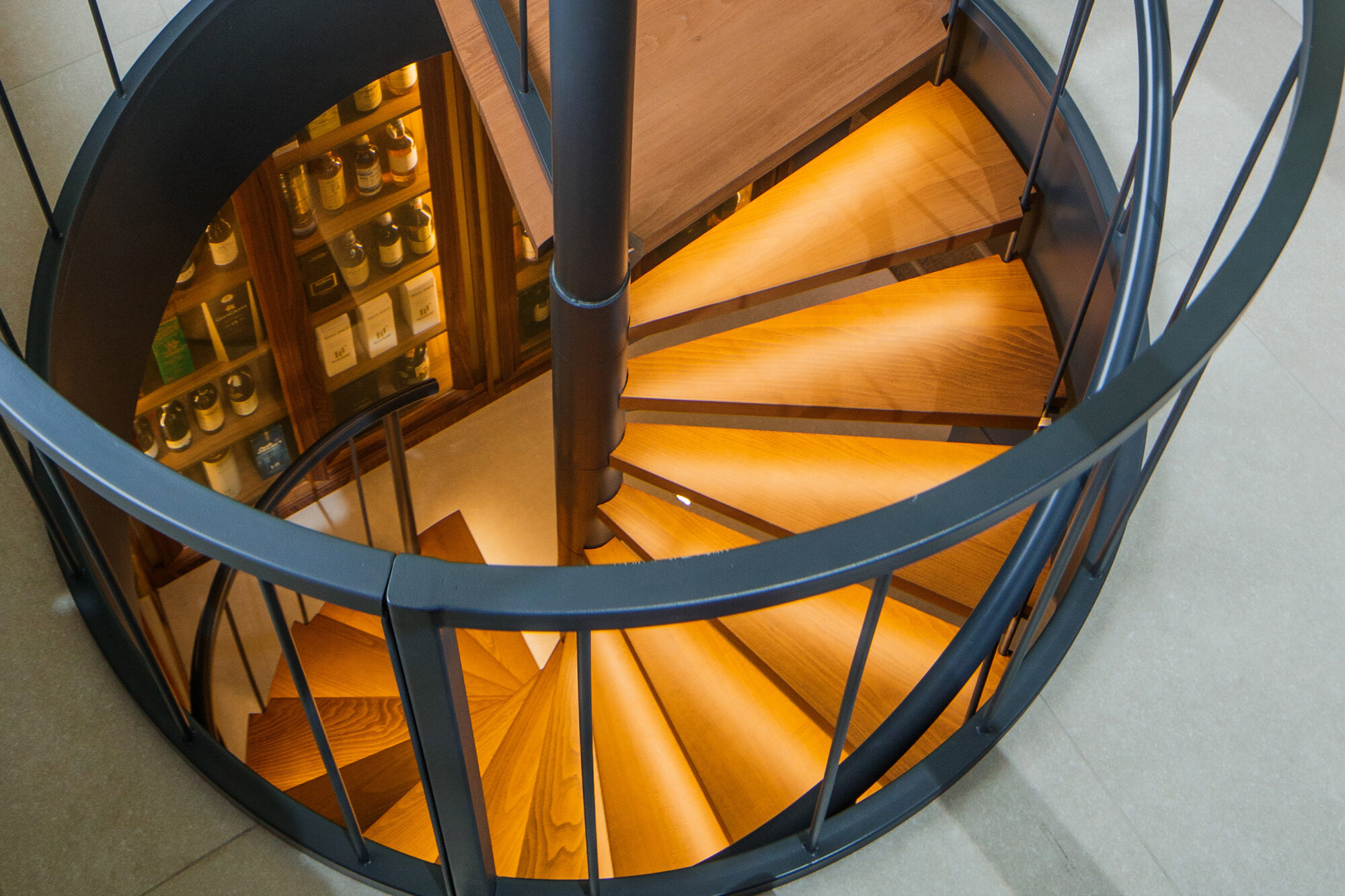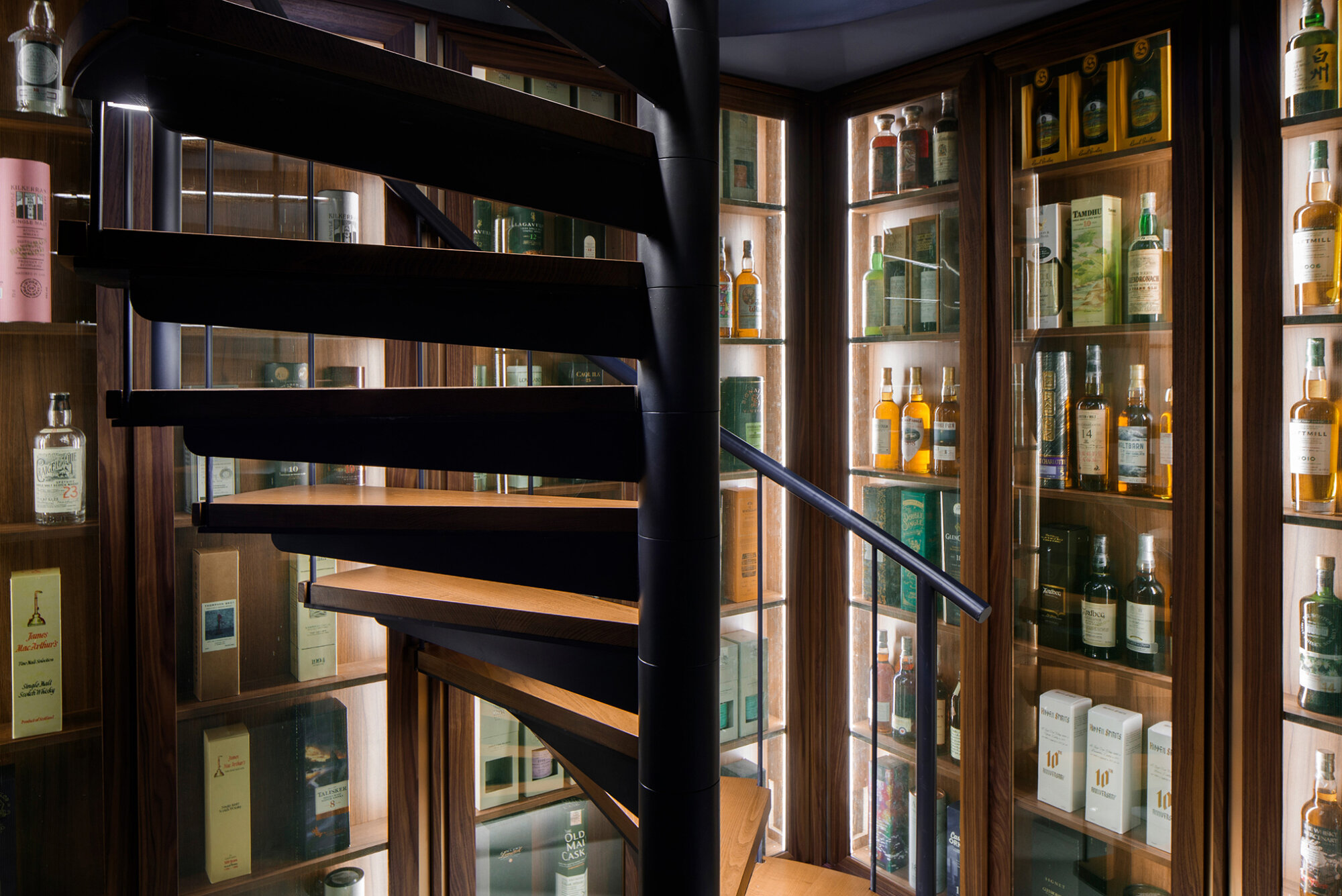 The social area and whiskey bar are concealed behind a hidden automated sliding bookshelf, with a circular staircase leading down to the basement. This staircase is flanked by custom-built shelves that house an extensive collection of rare and limited-edition whiskey bottles.