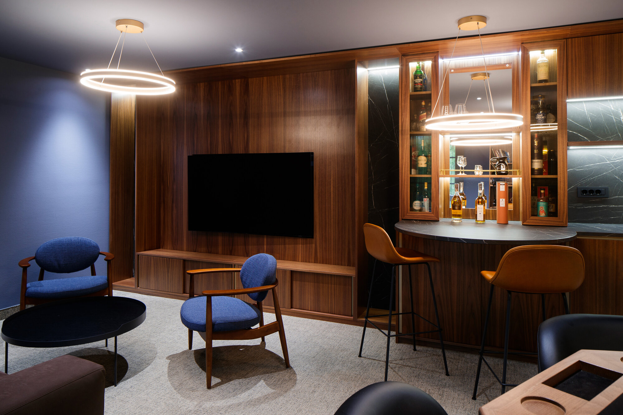 Influenced by the American modernist luxury design aesthetics of the 1960s and 1970s, we infused the space with the spirit of 1920s speakeasy bars. Special attention was given to the finishes and custom-designed details, highlighted by subtle lighting precisely positioned to emphasize the intimate atmosphere. This unique space is dedicated to socializing and catering to true whiskey connoisseurs.